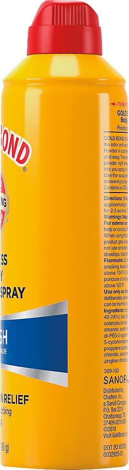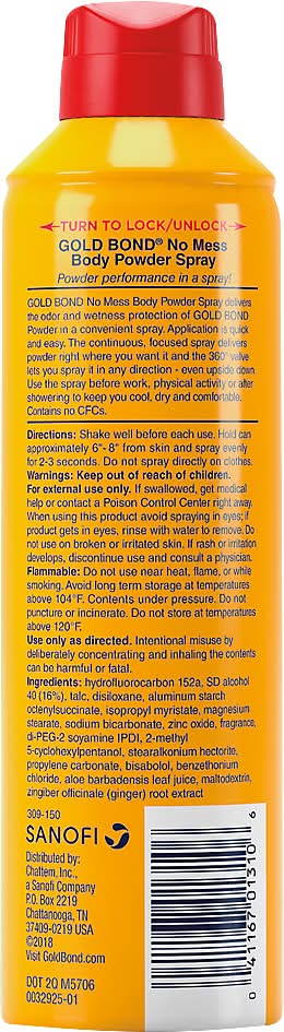 Trusted soothing since 1908. Triple action relief. Cooling. Absorbing. Relieving. Gold Bond No Mess Body Powder Spray. Powder performance in a spray! Gold Bond No Mess Body Powder Spray delivers the odor and wetness protection of Gold Bond Powder in a convenient spray. Application is quick and easy. The continuous, focused spray delivers powder right where you want it and the 360 degrees valve lets you spray it in any direction - even upside down. Use the spray before work, physical activity or after showering to keep you cool, dry and comfortable. Contains no CFCs. GoldBond.com. Visit GoldBond.com. Chattem, Inc., PO Box 2219,Chattanooga,TN,37409-0219,USA