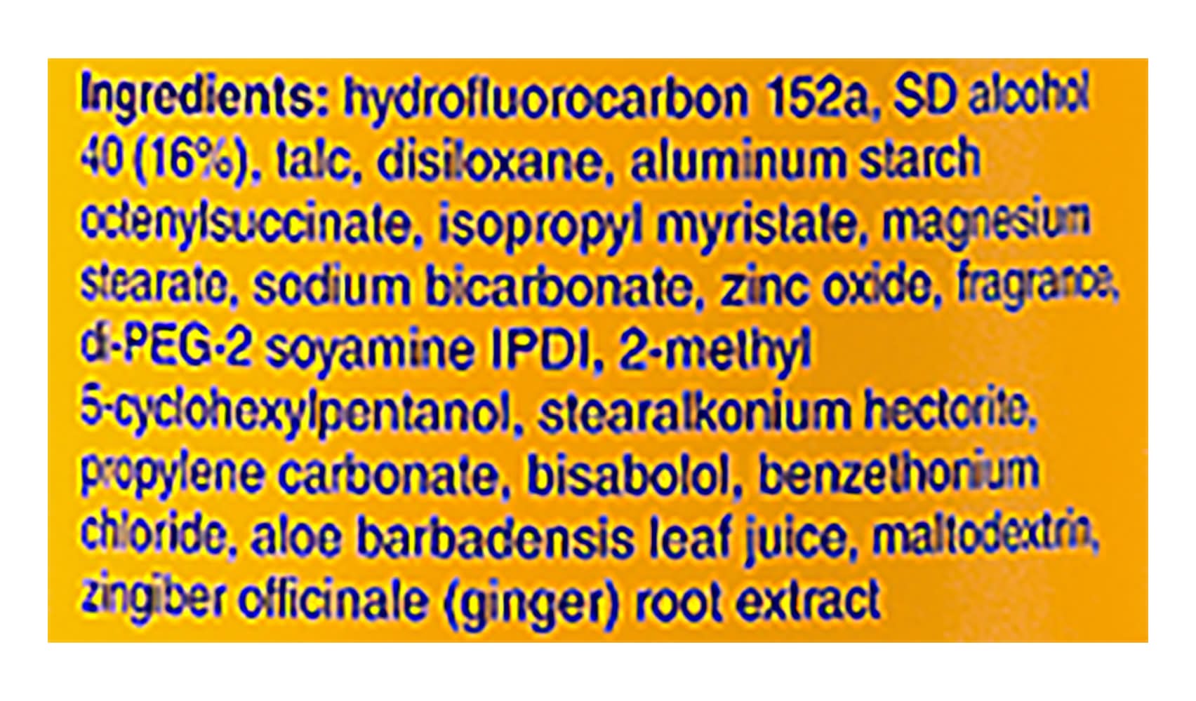 Ingredients: Hydrofluorocarbon 152a, SD Alcohol 40 (16%), Talc, Disiloxane, Aluminum Starch Octenylsuccinate, Isopropyl Myristate, Magnesium Stearate, Sodium Bicarbonate, Zinc Oxide, Fragrance, Di-PEG-2 Soyamine IPDI, 2-Methyl 5-Cyclohexylpentanol, Stearalkonium Hectorite, Propylene Carbonate, Bisabolol, Benzethonium Chloride, Aloe Barbadensis Leaf Juice, Maltodextrin, Zingiber Offcinale (Ginger) Root Extract