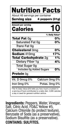 Peppers, Water, Vinegar, Salt, Citric Acid, FD&C Yellow #5, Calcium Chloride (to protect texture), Benzoate of Soda (as a preservative), Sodium Bisulfite (as a preservative) Contains: Sulphur Dioxide/Sulphites
