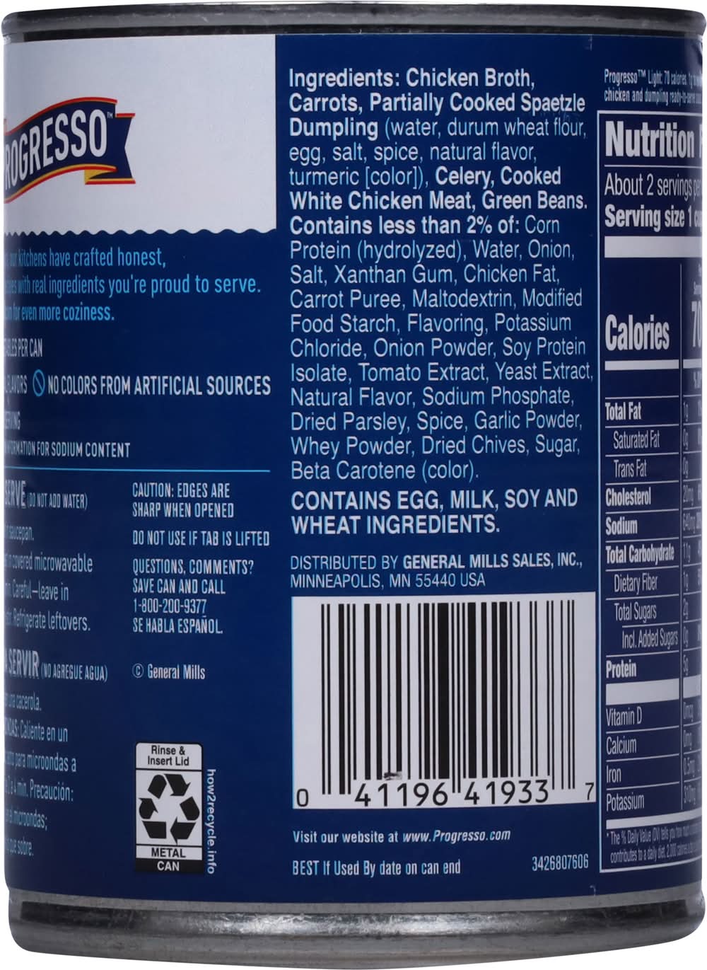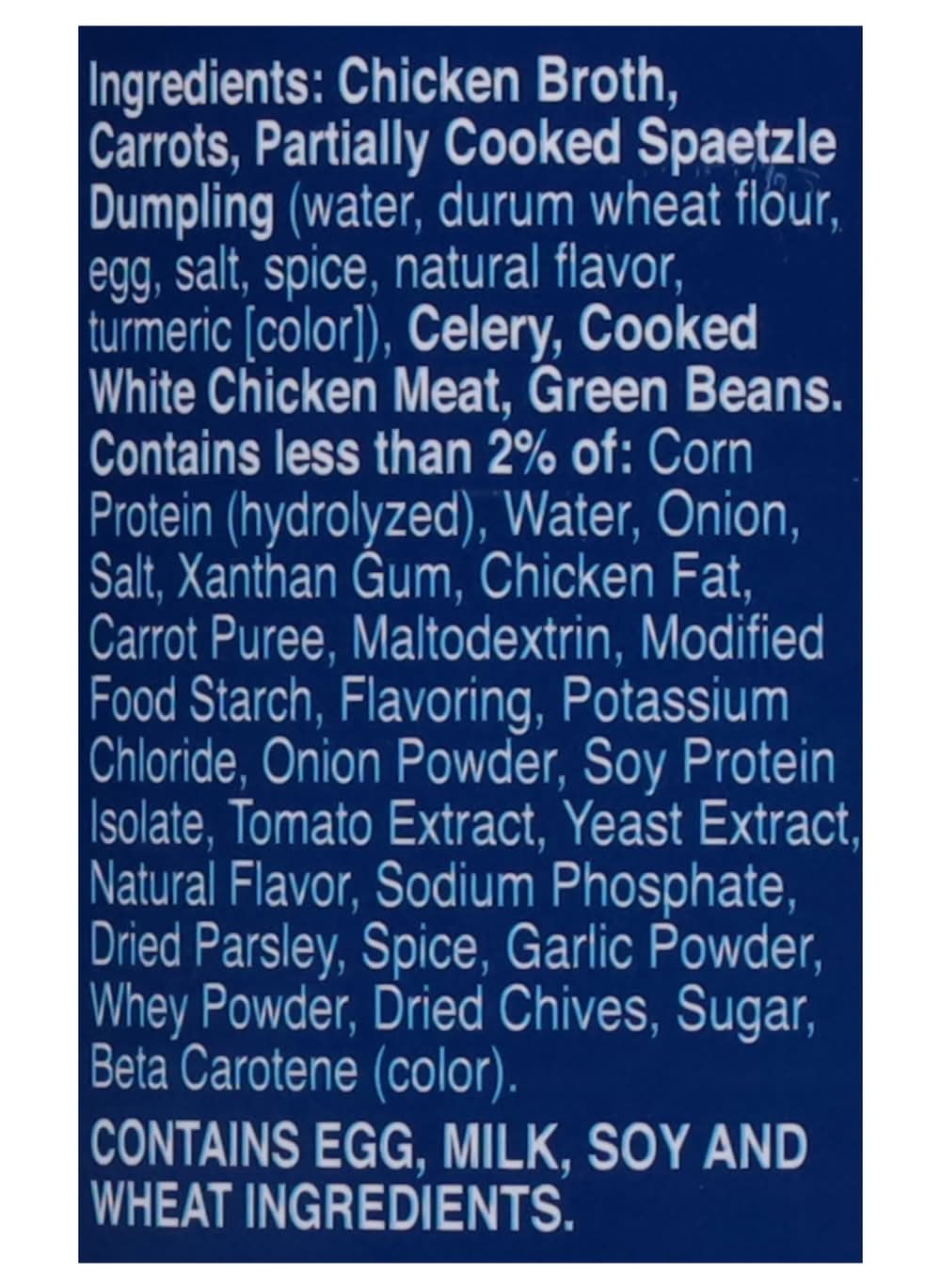Ingredients: Chicken Broth, Carrots, Partially Cooked Spaetzle Dumpling (Water, Durum Wheat Flour, Egg, Salt, Spice, Natural Flavor, Turmeric [Color]), Celery, Cooked White Chicken Meat, Green Beans, Contains Less than 2% of: Corn Protein (Hydrolyzed), Water, Onion, Salt, Xanthan Gum, Chicken Fat Carrot Puree, Maltodextrin, Modified Food Starch, Flavoring, Potassium Chloride, Onion Powder, Soy Protein Isolate, Tomato Extract, Yeast Extract, Natural Flavor, Sodium Phosphate, Dried Parsley, Spice, Garlic Powder, Whey Powder, Dried Chives, Sugar, Beta Carotene (Color) Contains: Eggs, Milk, Soybeans, Wheat, Celery