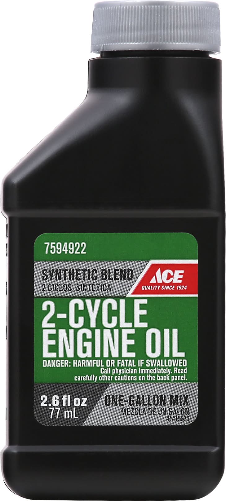 Quality since 1924. One-gallon mix. Meets or exceeds JASO-FD specifications for air cooled 2-cycle engines. Blended with fuel stabilizer, premium base stocks, and special synthetic additives which reduce wear causing abrasives, maintain proper engine temperature, reduce plug fouling and carbon build up. Check owners manual for proper gas/oil mixture. www.acehardware.com. Assembled in the USA with global components. • ACE Hardware, • Packaging: Reusable
