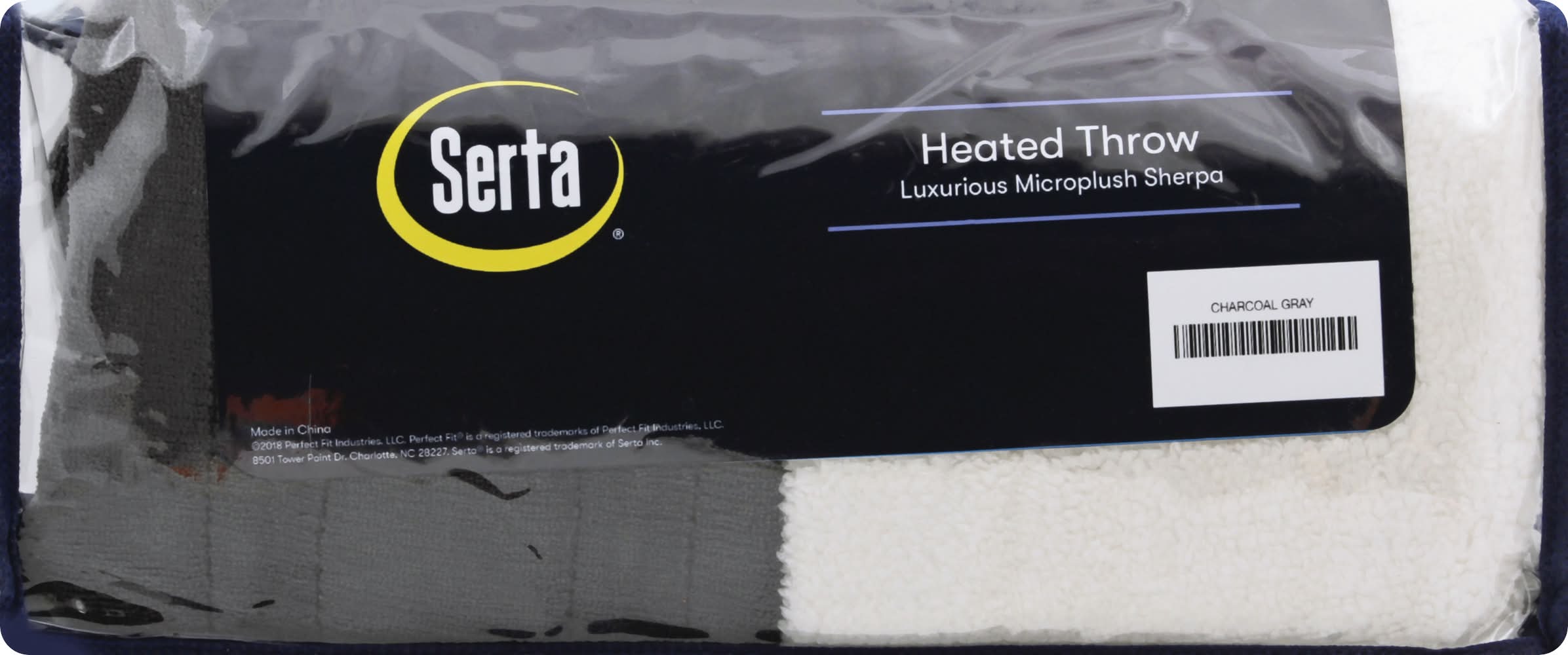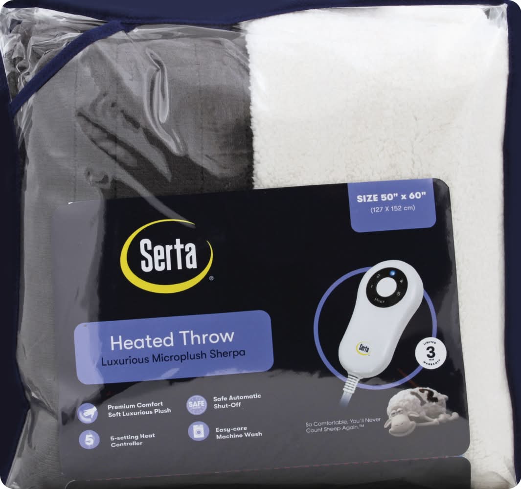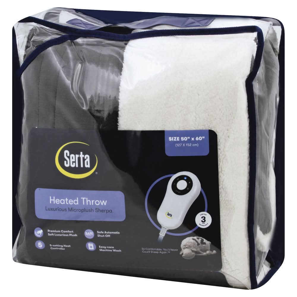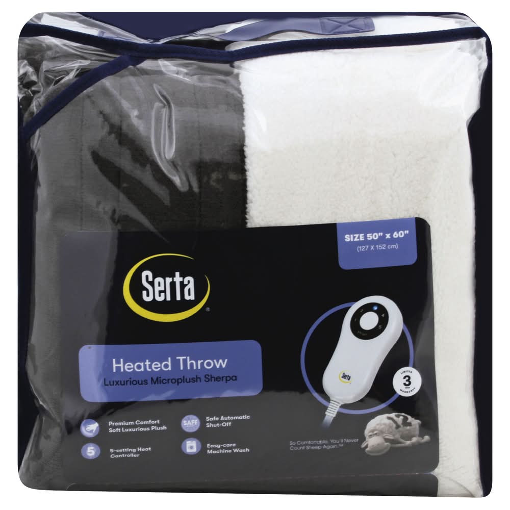 Luxurious microplush sherpa. Size: 50 in x 60 in (127 x 152 cm). Luxurious Microplush Sherpa. Premium comfort soft luxurious plush. Safe automatic shut-off. 5 - setting heat controller. Easy - care machine wash. So comfortable. You'll never count sheep again. Limited 3 years warranty. Made in China. Serta,