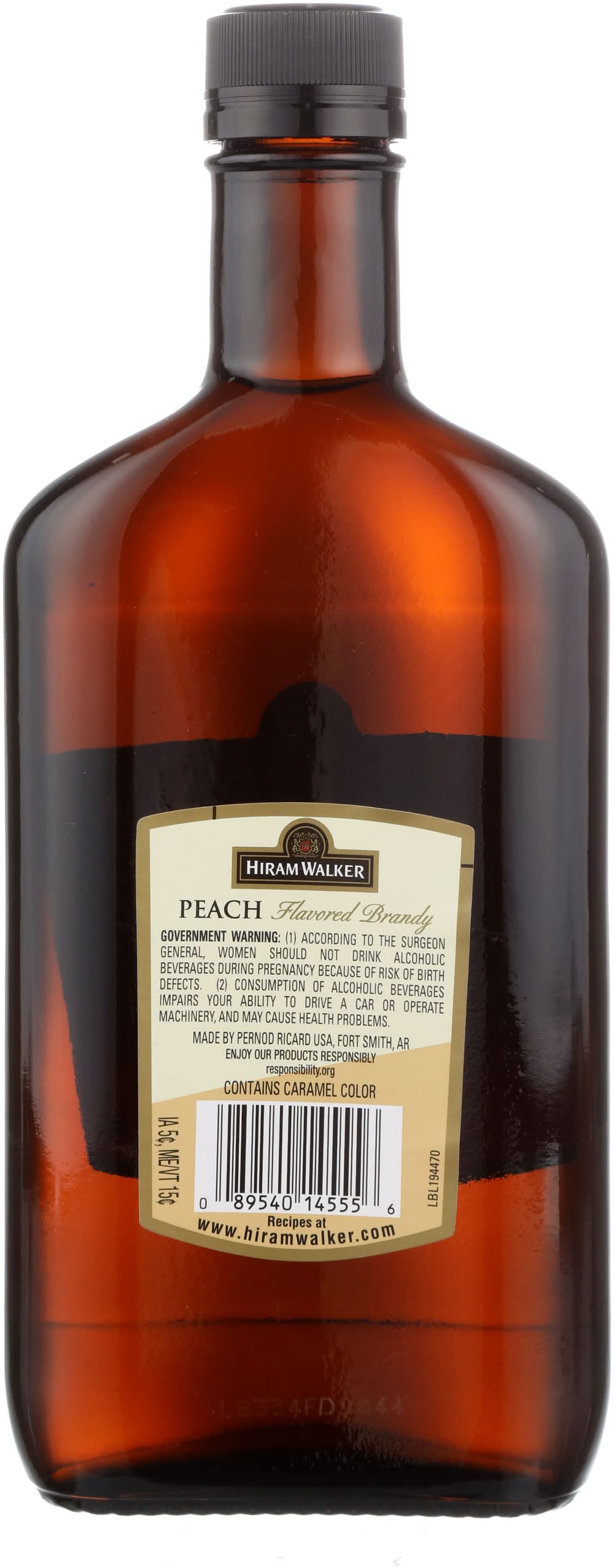 Hiram Walker Peach Brandy is a delicious blend of fine brandy spirits and delicate, sun-ripened peaches. Alcohol by volume: 30%