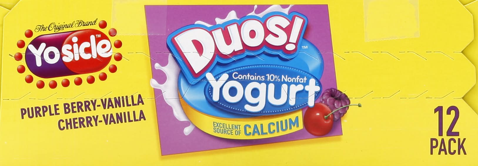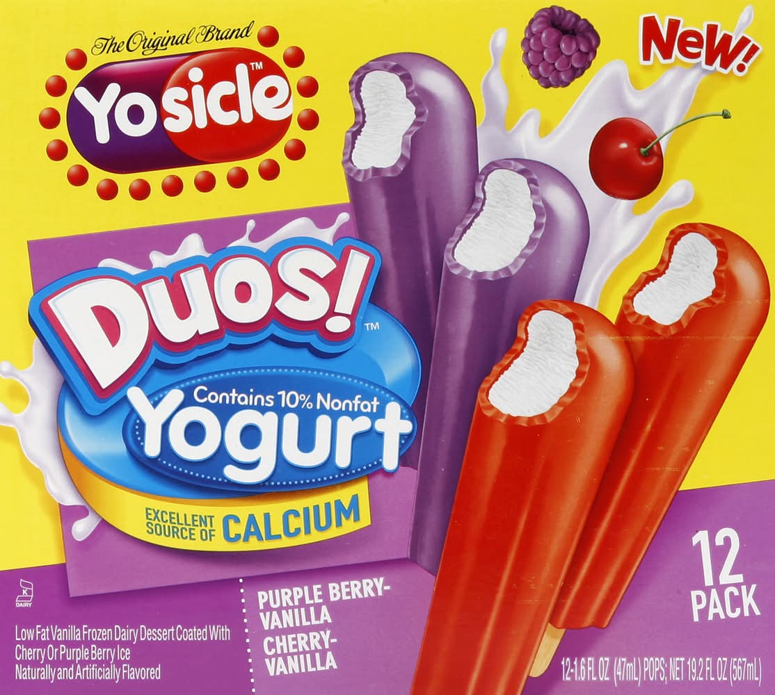 Low fat vanilla frozen dairy dessert coated with cherry or purple berry ice. Naturally and artificially flavored. Contains 10% nonfat yogurt. Excellent source of calcium. If it's Sicle it's fun! Gotta get one! Recyclable. UNILEVER,