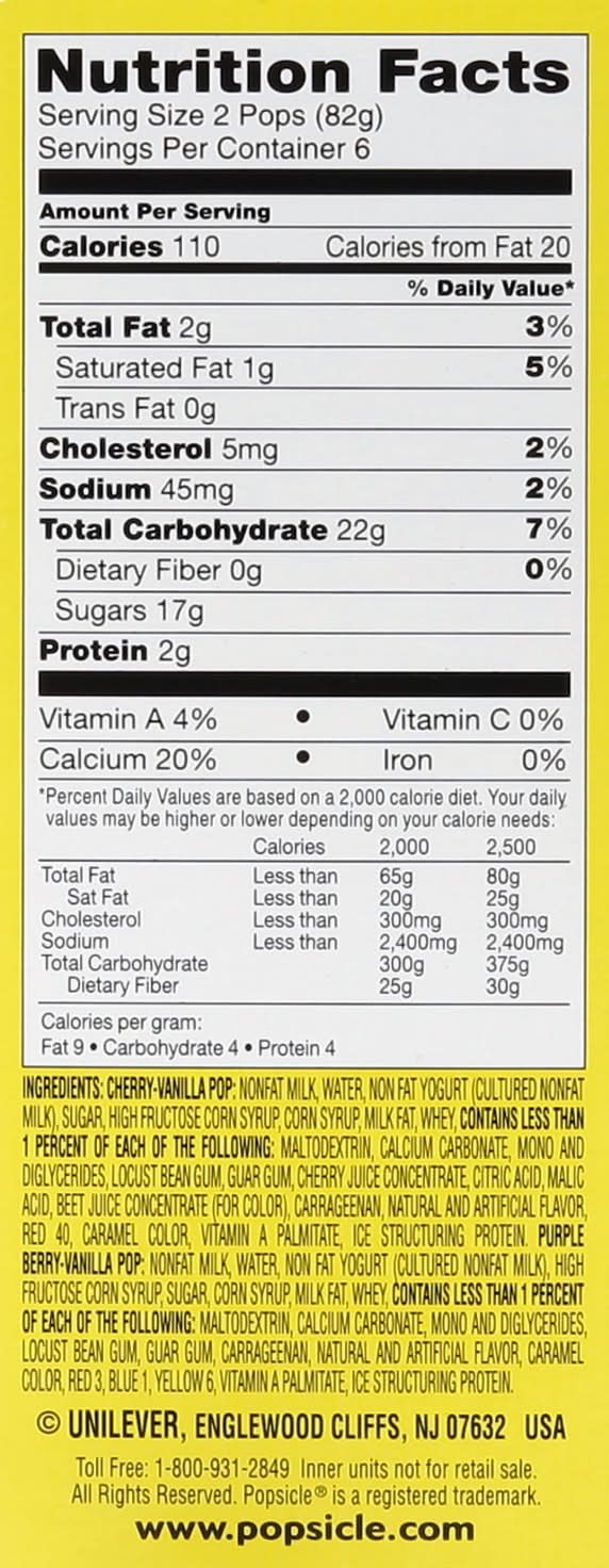 Cherry-Vanilla Pop: Nonfat Milk, Water, Non Fat Yogurt (Cultured Nonfat Milk), High Fructose Corn Syrup, Corn Syrup, Milk Fat, Whey, Contains Less than 1 Percent of Each of the Following: Maltodextrin, Calcium Carbonate, Mono and Diglycerides, Locust Bean Gum, Guar Gum, Cherry Juice Concentrate, Citric Acid, Malic Acid, Beet Juice Concentrate (for Color), Carrageenan, Natural and Artificial Flavor, Red 40, Caramel Color, Vitamin A Palmitate, Ice Structuring Protein, Purple Berry-Vanilla Pop: Nonfat Milk, Water, Non Fat Yogurt (Cultured Nonfat Milk), High Fructose Corn Syrup, Sugar, Corn Syrup, Milk Fat, Whey, Contains Less than 1 Percent of Each of the Following: Maltodextrin, Calcium Carbonate, Mono and Diglycerides, Locust Bean Gum, Guar Gum, Carrageenan, Natural and Artificial Flavor, Caramel Color, Red 3, Blue 1, Vitamin A Palmitate, Ice Structuring Protein