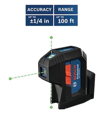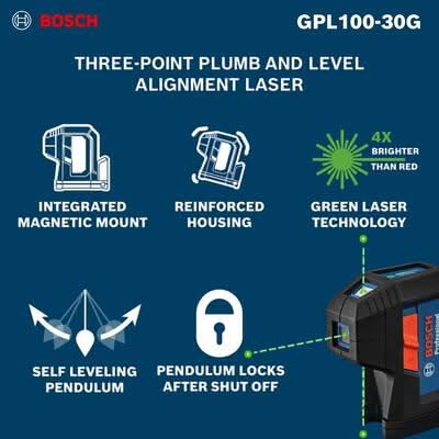 The Bosch GPL100-30G features a 3-point, self-leveling laser with plus orv minus 1/8 in. accuracy at 30 ft. for up/down plumb, align and level applications. This unit features Green-Beam technology, which is up to 4X brighter than standard red beams. It also has the Bosch-exclusive VisiMax technology, which delivers maximum beam brightness in most jobsite conditions. The unit includes point projection to the front, so it can be used in a variety of positions for flexibility on the job. It is faster than a standard manual plumb bob. The unit includes several durability features, such as the Smart Pendulum System to lock the laser when switched off, 360° rotation, a hard carrying case and full rubber over mold housing. The integrated multi-purpose laser mount features strong magnets and allows the user to mount the laser virtually anywhere.