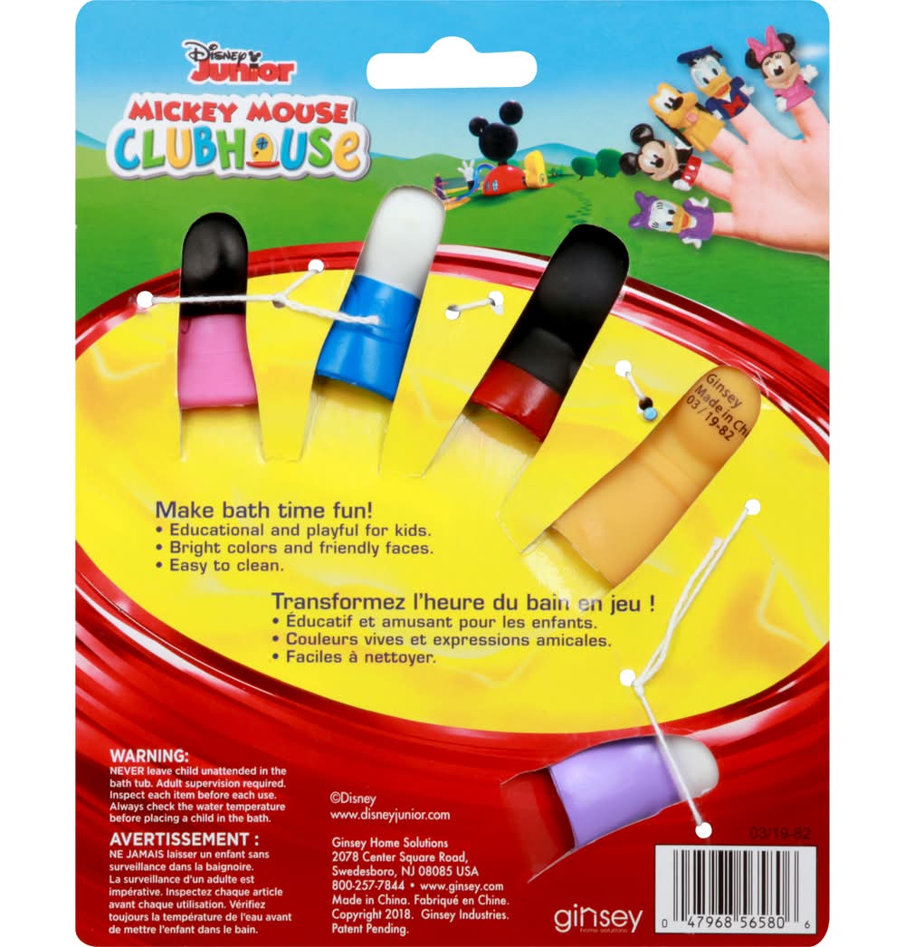 3+. Playful and educational bath time fun. Mickey House Club house. Make bath time fun! Educational and playful for kids. Bright colors and friendly faces. Easy to clean. www.disneyjunior.com. www.ginsey.com. Made in China. Ginsey Home Solutions,