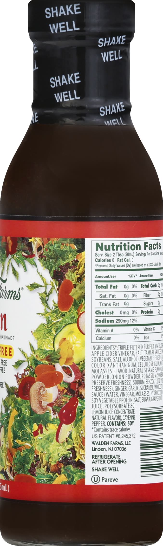 Calorie free. Sugar free. Fat free. Carbohydrate free. Gluten free. Cholesterol free. Just the right touch of the world's finest vinegars, ground herbs and spices, triple filtered water and natural flavors makes Walden Farms Asian Salad Dressing delicious and perfect when trying to eat right. 100 guaranteed. More calorie free specialties waldenfarms.com. Walden Farms,