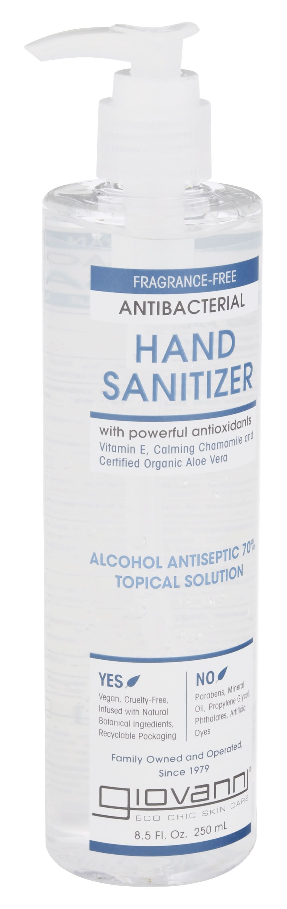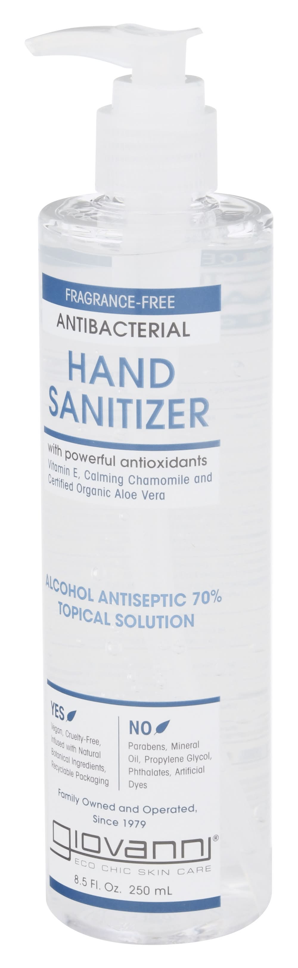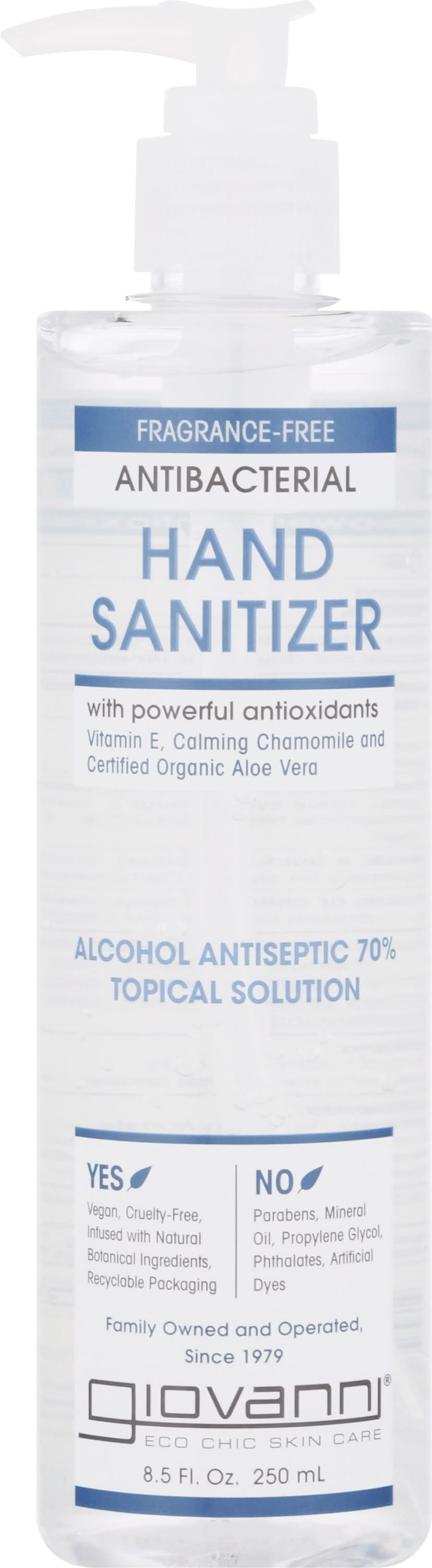 Other Information: Store between 15 degrees - 30 degrees C (59 degrees - 86 degrees F). Avoid freezing and excessive heat above 40 degrees C (104 degrees F). With powerful antioxidants. Vitamin E, calming chamomile and certified organic aloe vera. Yes: Vegan. USDA certified organic. Alcohol antiseptic 70% topical solution. Yes: With natural botanical ingredients. No: Parabens, mineral oil, propylene glycol, phthalates, artificial dyes. Family owned and operated since 1979. Eco Chic skincare giovanniecosmetics.com. Questions? 1-800-563-5468 (Monday thru Friday 8:00AM - 5:00PM PST). Recyclable packaging. Yes: Cruelty-free. Recyclable packaging. Please recycle. Made in U.S.A. from globally sourced materials. • Giovanni Cosmetics, • Packaging: Reusable
