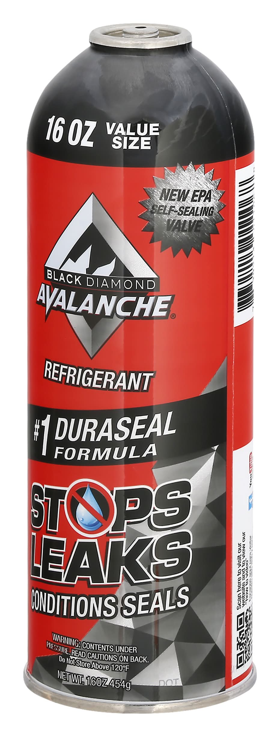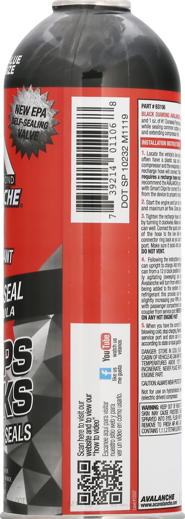 New EPA self-sealing valve. No. 1 Duracel formula. Stop leaks. Condition seals. Black Diamond Avalanche contains 15 oz of R-134a and 1 oz of no. 1 duraseal formula to ensure maximum cold air while sealing common rubber o-ring, gasket and hose leaks and extending compressor life. www.acavalanche.com. Scan here to visit our website and to view our how to video. Faceook like us. Youtube watch us. Made in USA from US & imported parts. TSI Products,