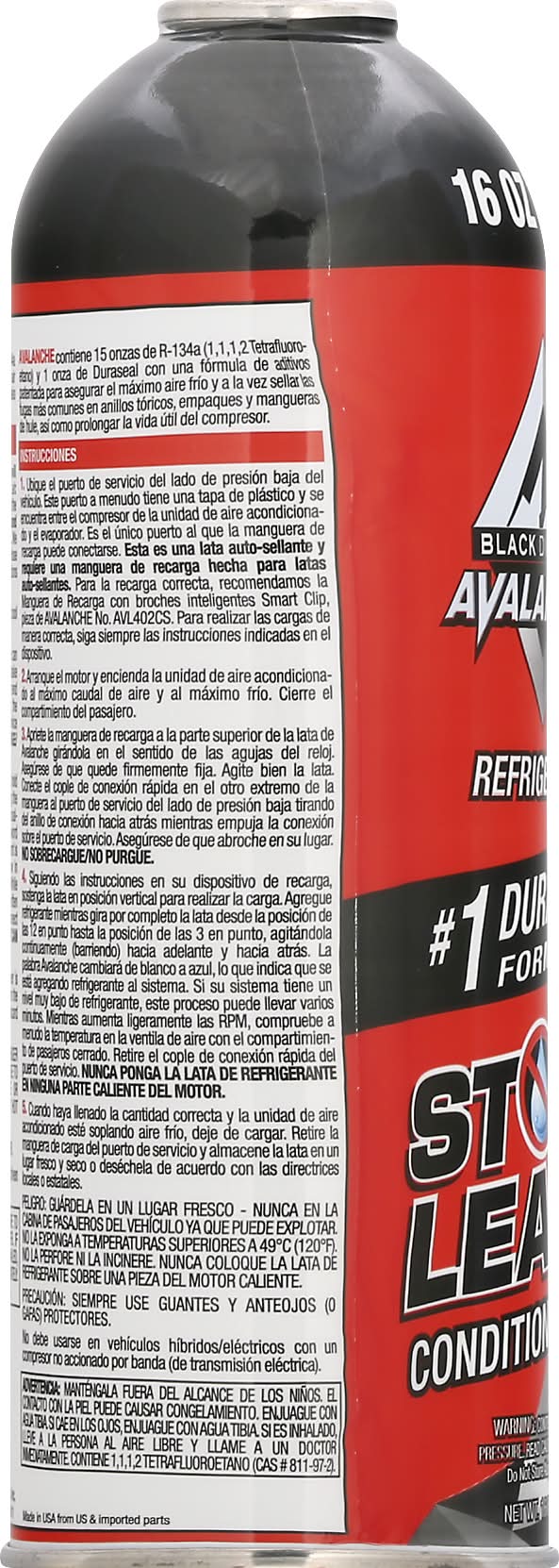 Directions for use: Directions: not store above 120 degrees F. Installation Instructions: 1. Locate the vehicle's low side service port. This port will often have a plastic cap and is located between the a/c compressor and the evaporator. It is only port to which the recharge hose will connect. This is a self-sealing can and requires a recharge hose made for self-sealing cans. We recommend the Avalanche part AVL402CS recharge hose with smart clips for correct fill. Always follow the instructions from the device to properly charge. 2. Start the engine and turn air conditioner to maximum cool and maximum air flow. Close passenger compartment. 3. Tighten the recharge hose to the top of the Avalanche can by turning it clockwise. Make sure it is firmly attached. Shake can well. Connect the quick connect coupler on the other end of the hose to the low side service port by pulling the connector ring back as you push the fitting onto the service port. Make sure it locks into place. Do not overcharge/do not vent. 4. Following the instructions on your recharge device, hold can upright to charge. Add refrigerant while fully rotating the can from a 12 o'clock position to 3 o'clock position, continually agitating (sweeping) can back and forth. The word Avalanche will turn from white to blue indicating refrigerant is being added to the system. If your system is very low in refrigerant this process can take several minutes. While slightly increasing your RPM, check vent temperature often with passenger compartment closed. Remove quick-connect coupler from service port. Never refrigerant can on any hot engine part. 5. When you have the correct fill and your air conditioner is blowing cold, stop charging. Remove the charging hose from the service port and store can in a cool, dry place or discard according to state or local guidelines. Storage recommendation: Do not store above 120 degrees F.