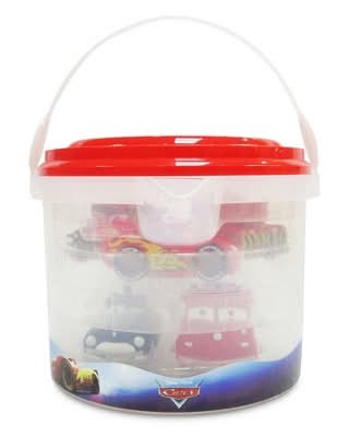 Fill 'er up! Lightning McQueen, and a championship team of characters from Cars will have your little speedster racing to take a bath with this fun set! Housed in a clear pail with a colorful strainer lid, it'll pour on the excitement. Includes bucket with straining lid and five figures. Genuine, Original, Authentic Disney Store Product.
