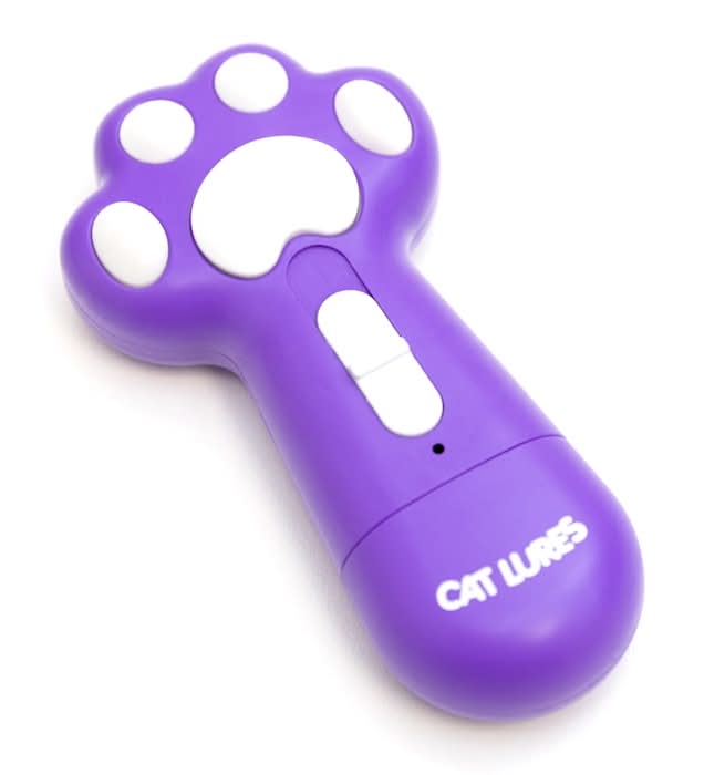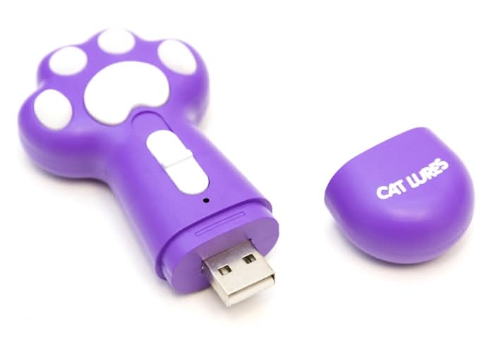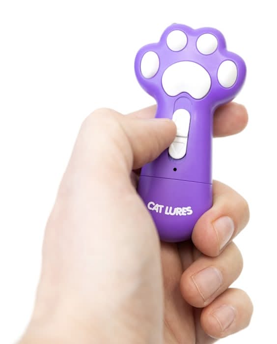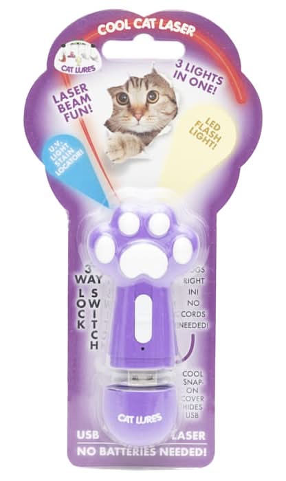 The switch stays in place so there is no need to hold down a button. One short charge gives you hours of play! The classic red laser will have your cat in a frenzy. The flashlight will help you in the dark. The stain locator light will help you find a mess. A tool and a great cat toy all in one! Size: 0.09 lb