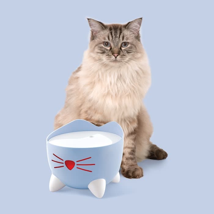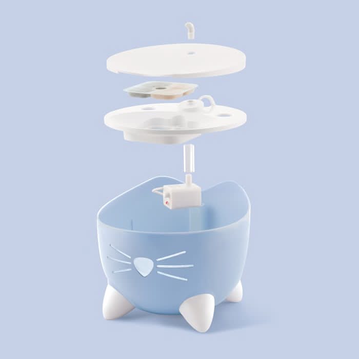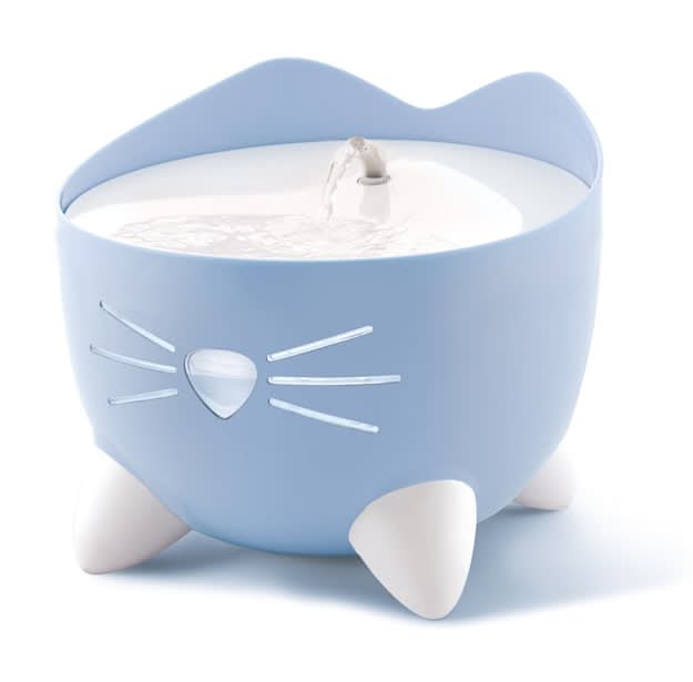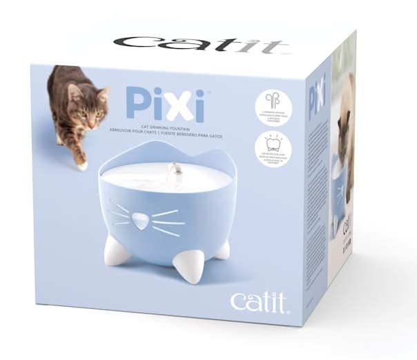 The Catit PIXI Fountain provides your cat with a continuous source of fresh, purified water. The PIXI offers multiple drinking options to entice picky drinkers: calm flow, stream (with spout) and bubbling top. The featured drip collection zone helps stray drops of water to flow back into the reservoir. PIXI's little nose is a backlit water level window and with a water level window this adorable, you'll never lose sight of how much water is left. Fill the reservoir until the water level reaches the top of the whiskers, which marks the reservoir's maximum capacity. The pump is equipped with a sensor that detects when the water level is too low. At that point, the fountain will shut down automatically, to prevent the pump from running dry. PIXI's nose will also flash red when the water level inside of the reservoir is too low. Once the water reservoir is refilled, the fountain will start running again. • Color: Pink • Size: 2.20 lb