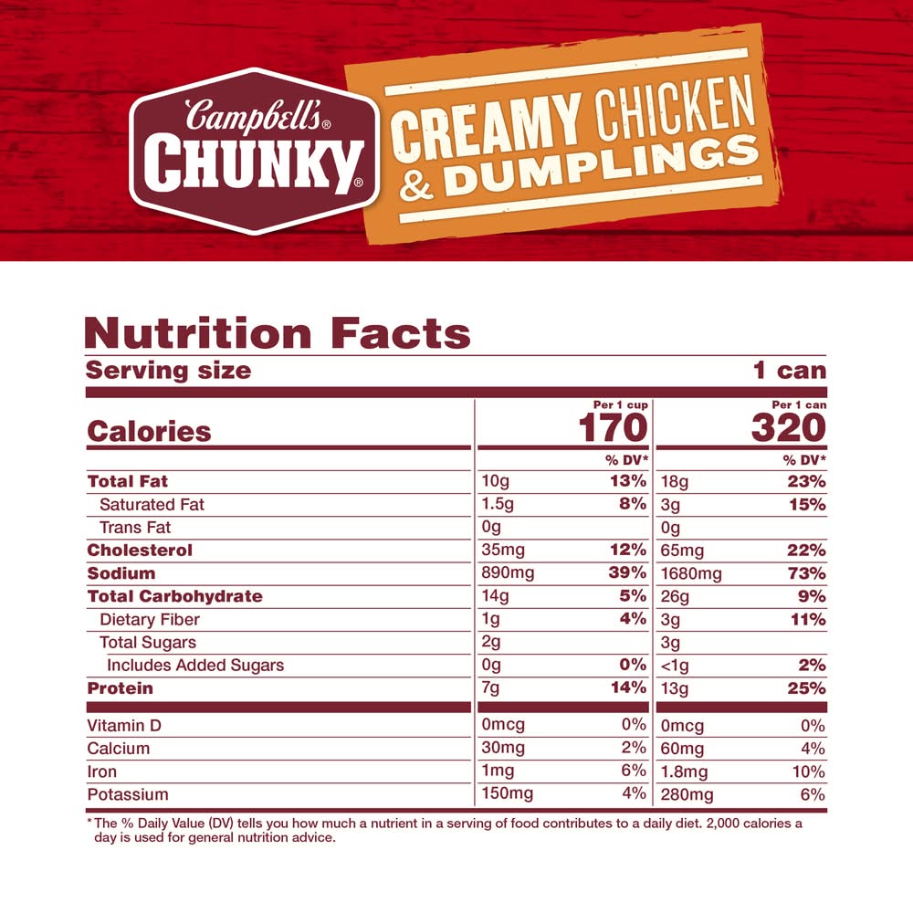Campbell’s Chunky Creamy Chicken and Dumplings Soup isn’t just tasty—it's made to work as hard as you do. With never-ending big flavors and bold ingredients, this comfort food classic is capable of fueling even the heartiest appetite. This ready-to-eat chicken soup is crafted with big pieces of chicken meat without antibiotics, chunks of carrots and celery, and spaetzle dumplings. Each can has 13 grams of protein. It Fills You Up Right. Just pop this soup in a microwave-safe bowl, heat and enjoy. Or, warm it over the campfire on your outdoor adventures. Whether you’re looking for quick and easy to microwave soups for home or something to take on the go, Campbell’s has you covered. Take on the great outdoors with Campbell’s Chunky Creamy Chicken and Dumplings Soup—Soup That Eats Like a Meal. Size: 16.3 OZ