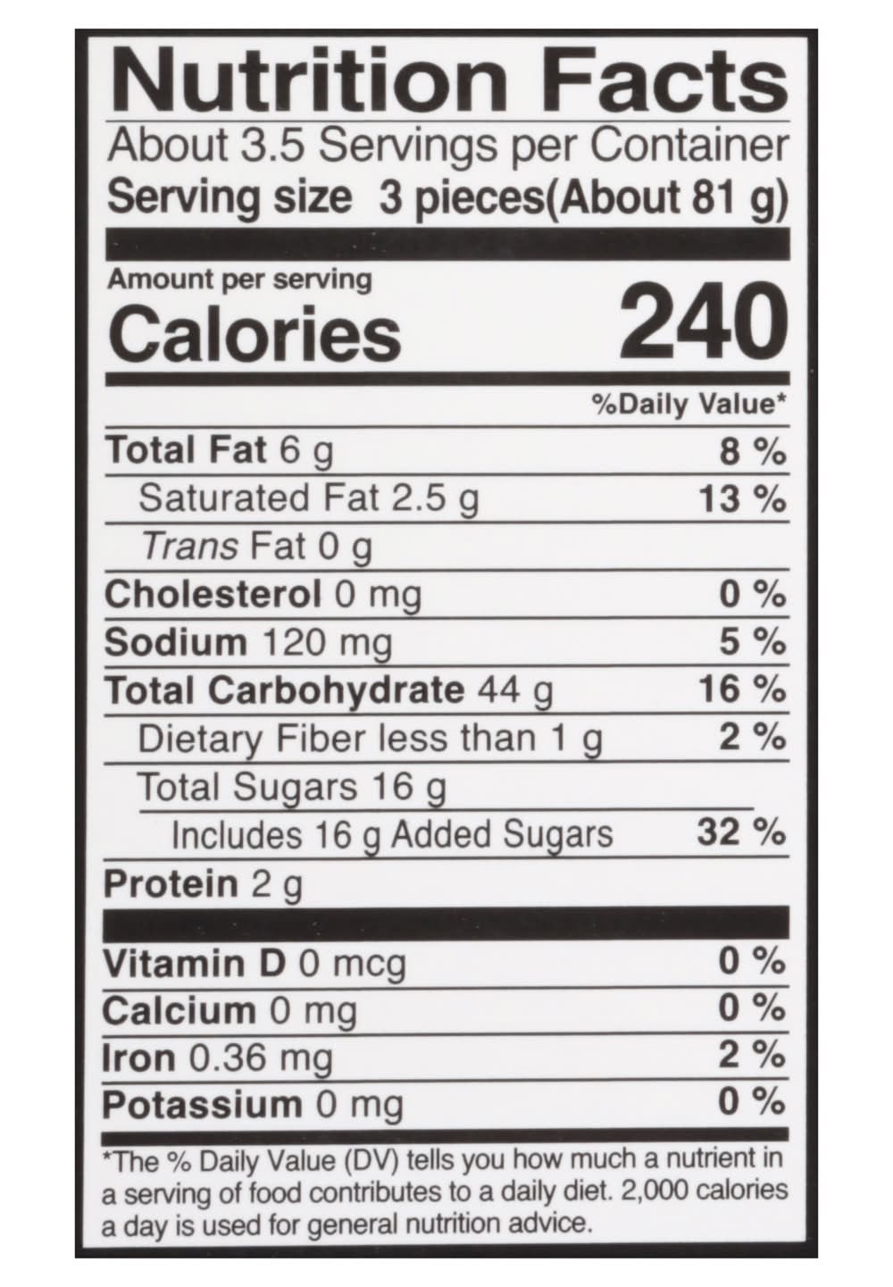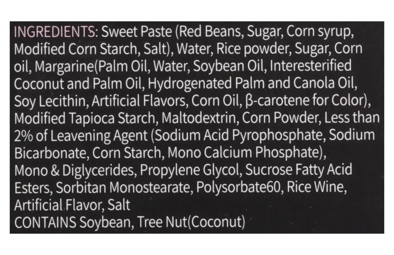 Sweet Paste (Red Beans, Sugar, Corn Syrup, Modified Corn Starch, Salt), Water, Rice Powder, Sugar, Corn Oil, Margarine(Palm Oil, Water, Soybean Oil, Interesterified Coconut and Palm Oil, Hydrogenated Palm and Canola Oil, Soy Lecithin, Artificial Flavors, Corn Oil, Beta-Carotene for Color), Modified Tapioca Starch, Maltodextrin, Corn Powder, Less than 2% of Leavening Agent (Sodium Acid Pyrophosphate, Sodium Bicarbonate, Corn Starch, Mono Calcium Phosphate), Mono & Diglycerides, Propylene Glycol, Sucrose Fatty Acid Esters, Sorbitan Monostearate, Polysorbate 60, Rice Wine, Artificial Flavor, Salt Contains: Corn, Soybeans, Tree Nuts, Coconuts