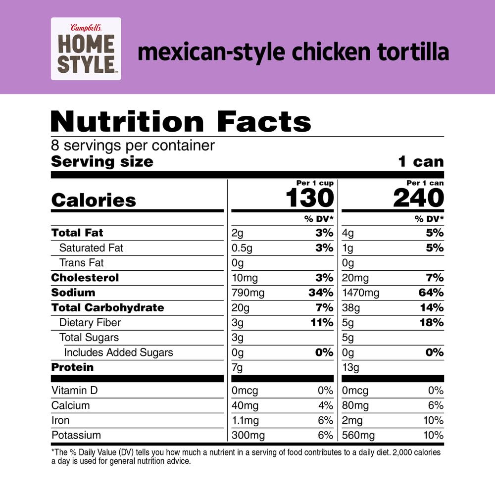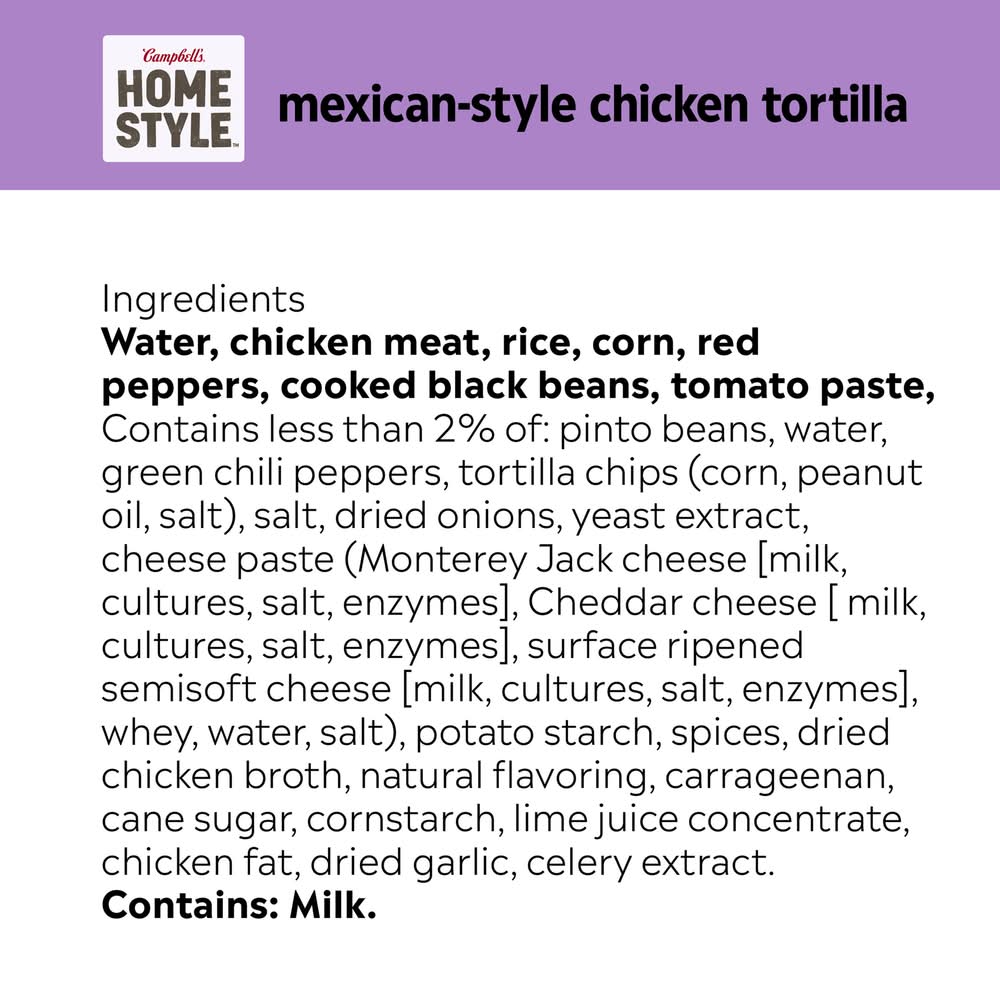 Enjoy the familiar tastes of home with every spoonful of Campbell's Homestyle Mexican-Style Chicken Tortilla Soup. Made with tender chunks of chicken meat with no antibiotics, rice, corn, beans, spicy chili peppers and tortilla chips, our hearty chicken soup is crafted with care to deliver a delicious homemade taste that’s sure to warm your heart. Top it with crushed tortilla chips and a bit of lime juice, or pair it with a sandwich or salad for something quick and easy. No matter the season, this convenient canned soup is a must-have pantry staple and comfort food that adds a satisfying warmth to any day. To prepare in the microwave, heat the microwave soup in a covered microwave-safe bowl for 2 to 2.5 minutes or until hot. Alternatively, you can heat it in a saucepan on the stove, stirring occasionally. Each 16.1 oz recyclable can contains 1 serving of soup and features an easy-open pop top and a non-BPA lining. Enjoy a comforting moment with a warm bowl of familiar, homemade flavors. Campbell’s Homestyle: The Taste That Takes You Home. Campbell Soup Company - ProductXM,