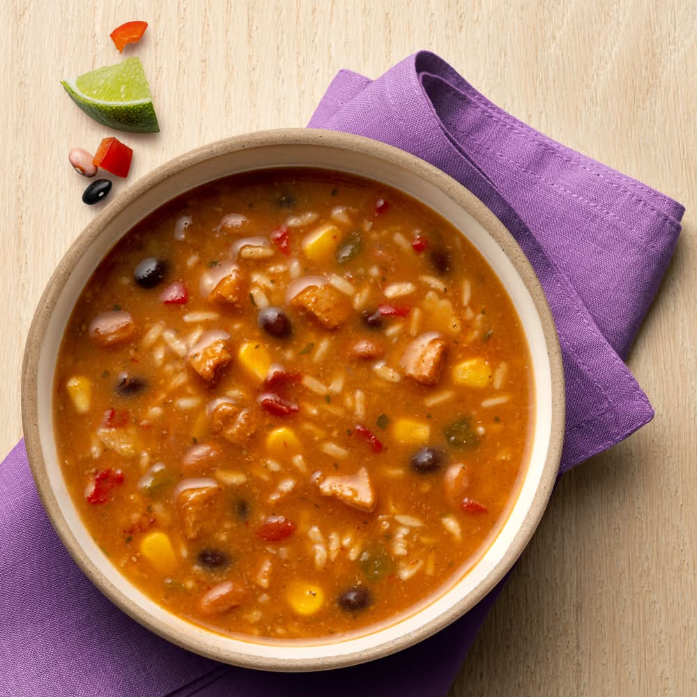 INGREDIENTS: WATER, CHICKEN MEAT, RICE, CORN, RED PEPPERS, COOKED BLACK BEANS, TOMATO PASTE, CONTAINS LESS THAN 2% OF: PINTO BEANS, WATER, GREEN CHILI PEPPERS, TORTILLA CHIPS (CORN, PEANUT OIL, SALT), SALT, DRIED ONIONS, YEAST EXTRACT, CHEESE PASTE (MONTEREY JACK CHEESE [MILK, CULTURES, SALT, ENZYMES], CHEDDAR CHEESE [MILK, CULTURES, SALT, ENZYMES], SURFACE RIPENED SEMISOFT CHEESE [MILK, CULTURES, SALT, ENZYMES], WHEY, WATER, SALT), POTATO STARCH, SPICES, DRIED CHICKEN BROTH, NATURAL FLAVORING, CARRAGEENAN, CANE SUGAR, CORNSTARCH, LIME JUICE CONCENTRATE, CHICKEN FAT, DRIED GARLIC, CELERY EXTRACT. CONTAINS: MILK MAY CONTAIN TRACES OF WHEAT Contains: CONTAINS: Milk/Dairy;MAY CONTAIN: Wheat