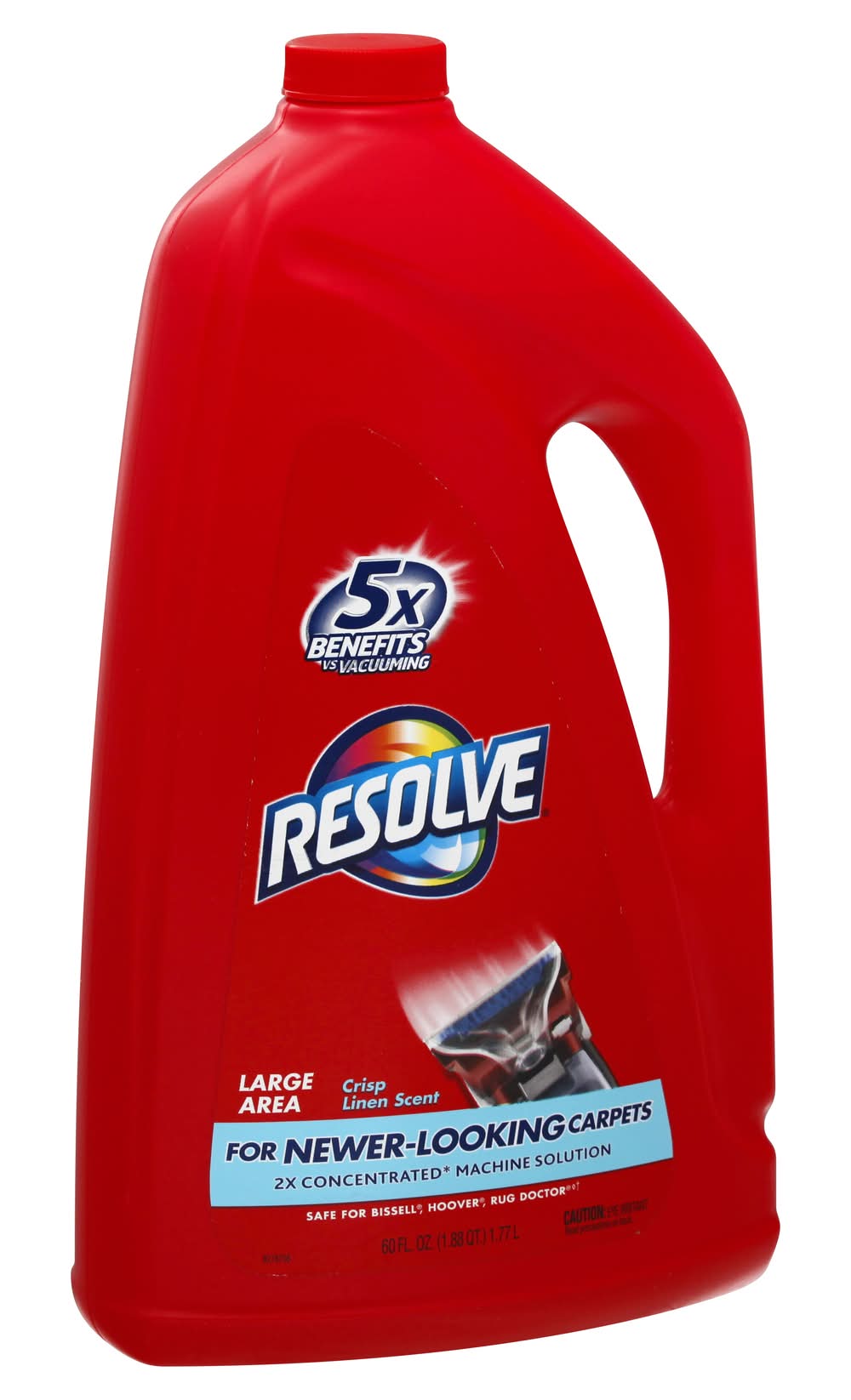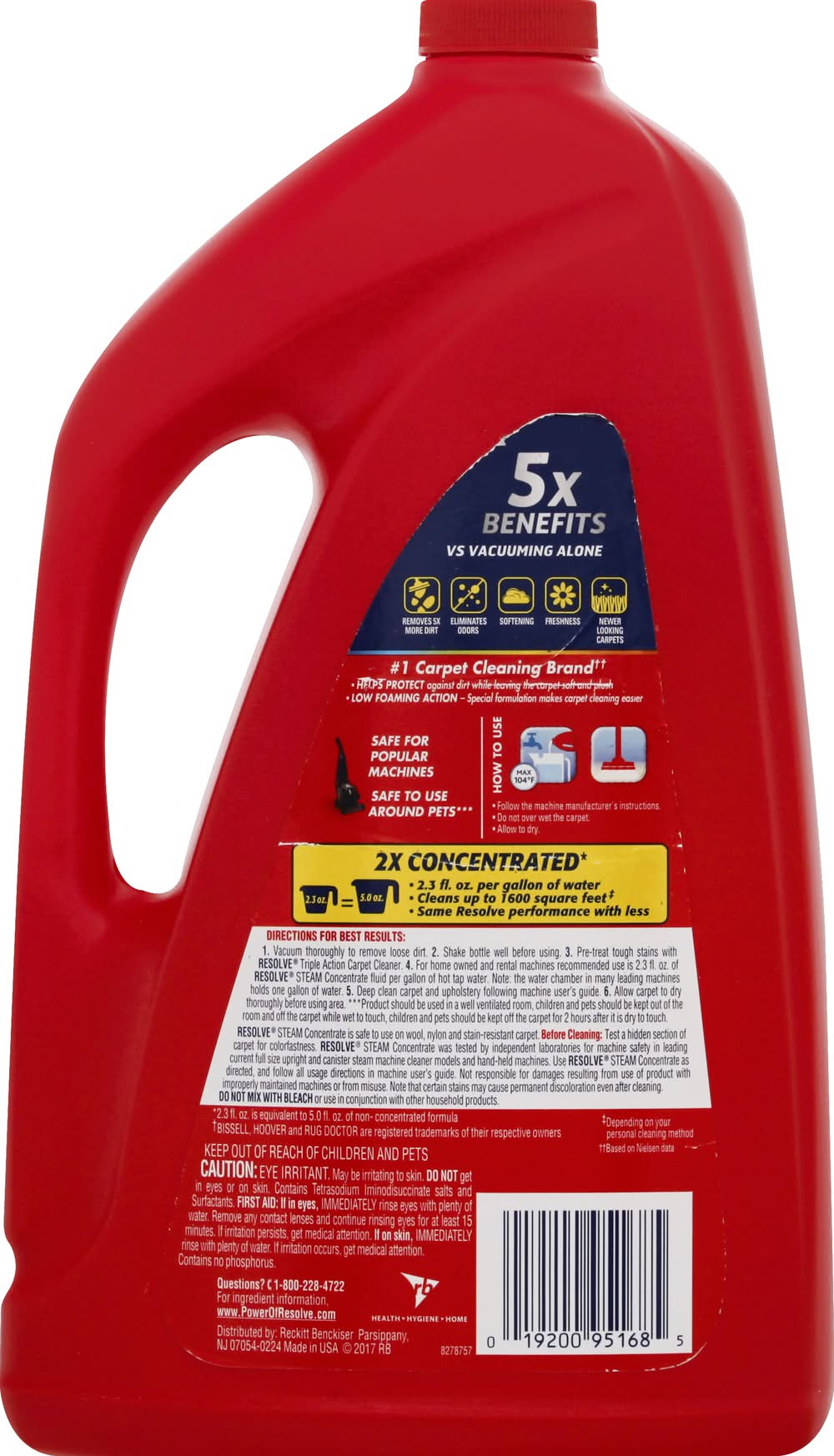 5x benefits vs vacuuming. For newer-looking carpets. 2x concentrated (2.3 fl oz is equivalent to 5.0 fl oz of non-concentrated formula) machine solution. Safe for Bissell, Hoover, Rug Doctor (Bissell, Hoover and Rug Doctor are registered trademarks of their respective owners). Removes 5x more dirt. Eliminates odors. Softening. Freshness. Never looking carpets. No. 1 Carpet Cleaning Brand (Based on Nielsen data): Helps protect against dirt while leaving the carpet-soft and plush. Low foaming action - Special formulation makes carpet cleaning easier. Safe to use around pets (Product should be used in a well ventilated room, children and pets should be kept out of the room and off the carpet while wet to touch, children and pets should be kept off the carpet for 2 hours after it is dry to touch). 2x Concentrated (2.3 fl oz is equivalent to 5.0 fl oz of non-concentrated formula): 2.3 fl oz per gallon of water; Cleans up to 1600 square feet (Depending on your personal cleaning method); Same resolves performance with less. Health. Hygiene. Home. Questions? 1-800-228-4722. For ingredient information. www.PowerOfResolve.com. Made in USA.