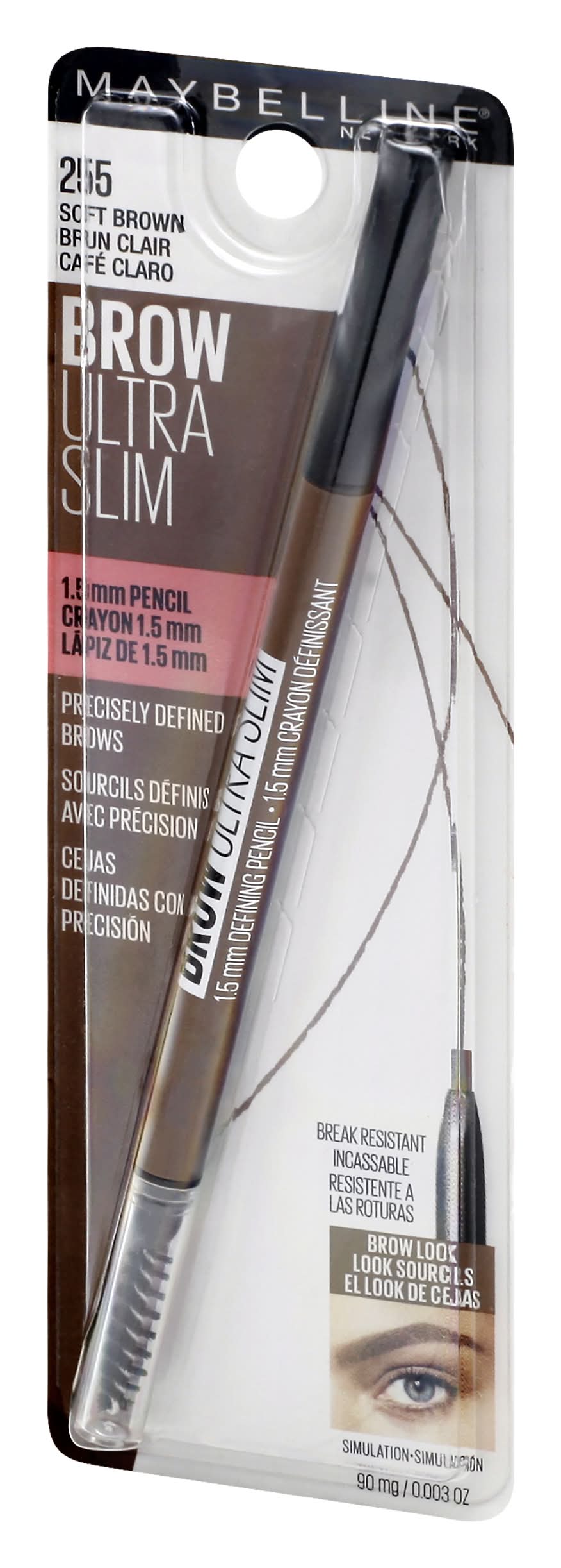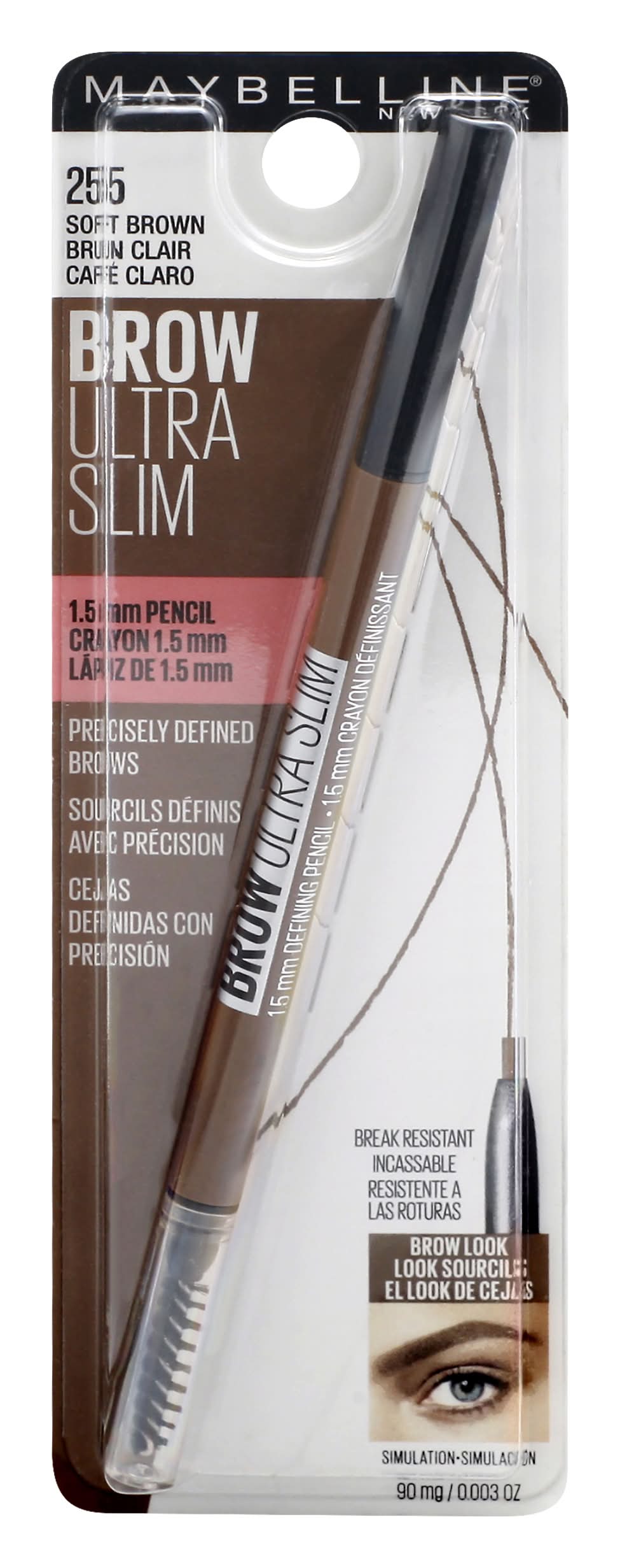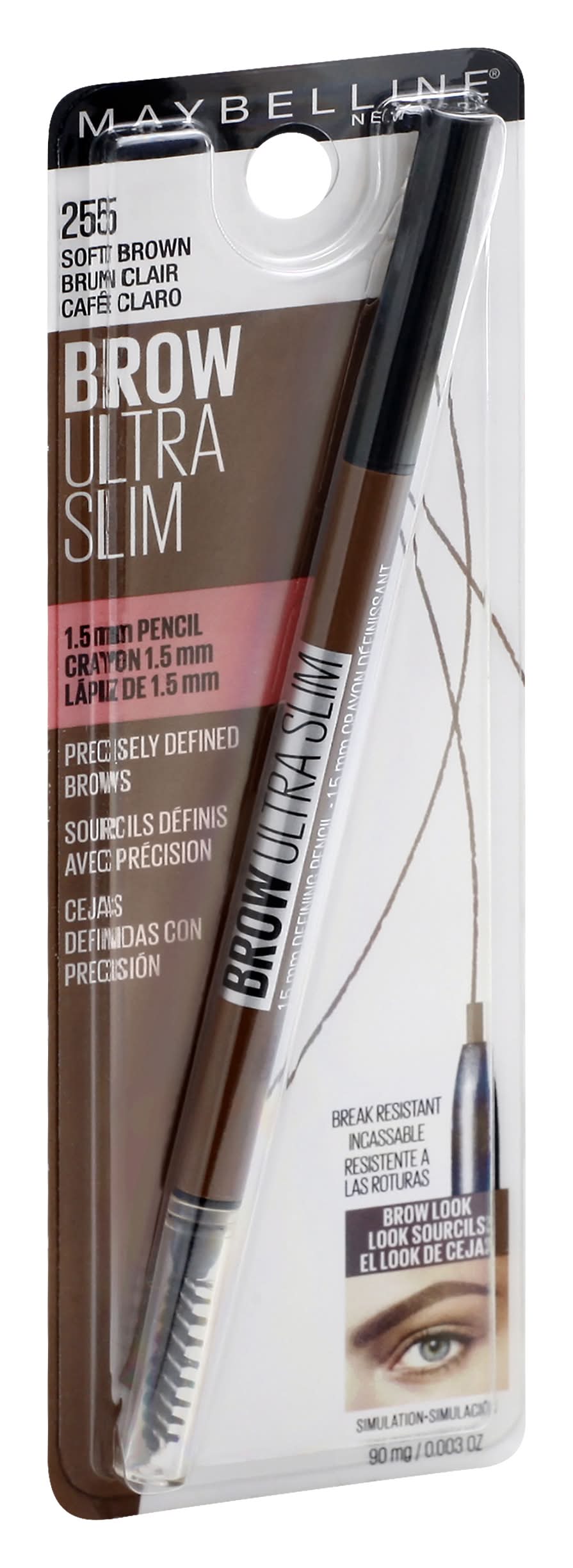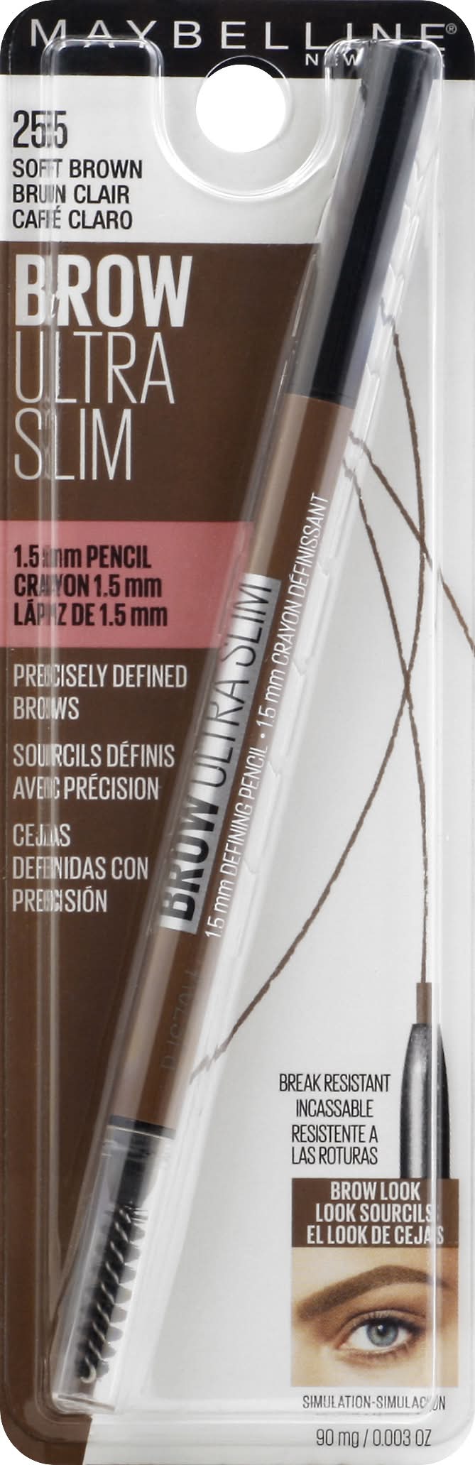 1.5 mm Pencil. Precisely defined brows. Break resistant. The Look: Precisely defined brows. Brow ultra slim defining pencil has a 1.5 mm micro-tip for precise. Hair-like strokes and a soft spoolie for blending. Glides on smoothly, break resistant. 1.5 mm Micro tip + spoolie. www.maybelline.com. Made in China. • Size: 1 CT • Maybelline LLC, New York, NY, 10001