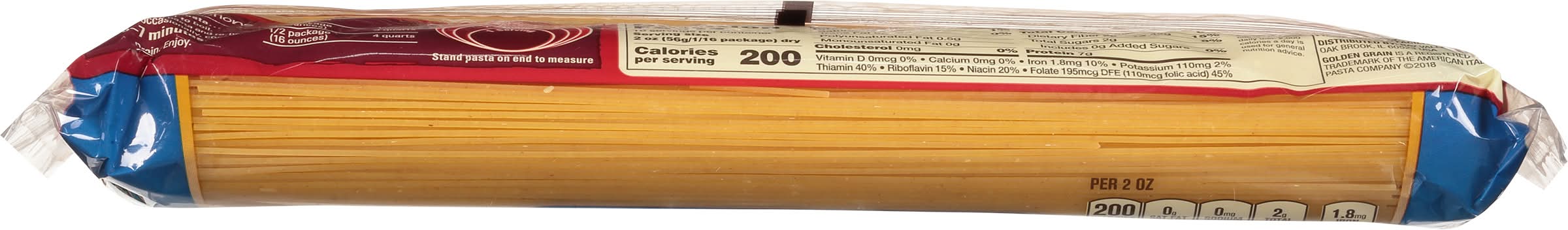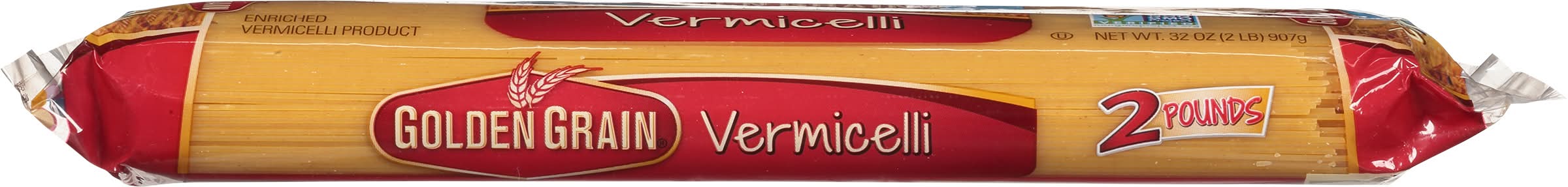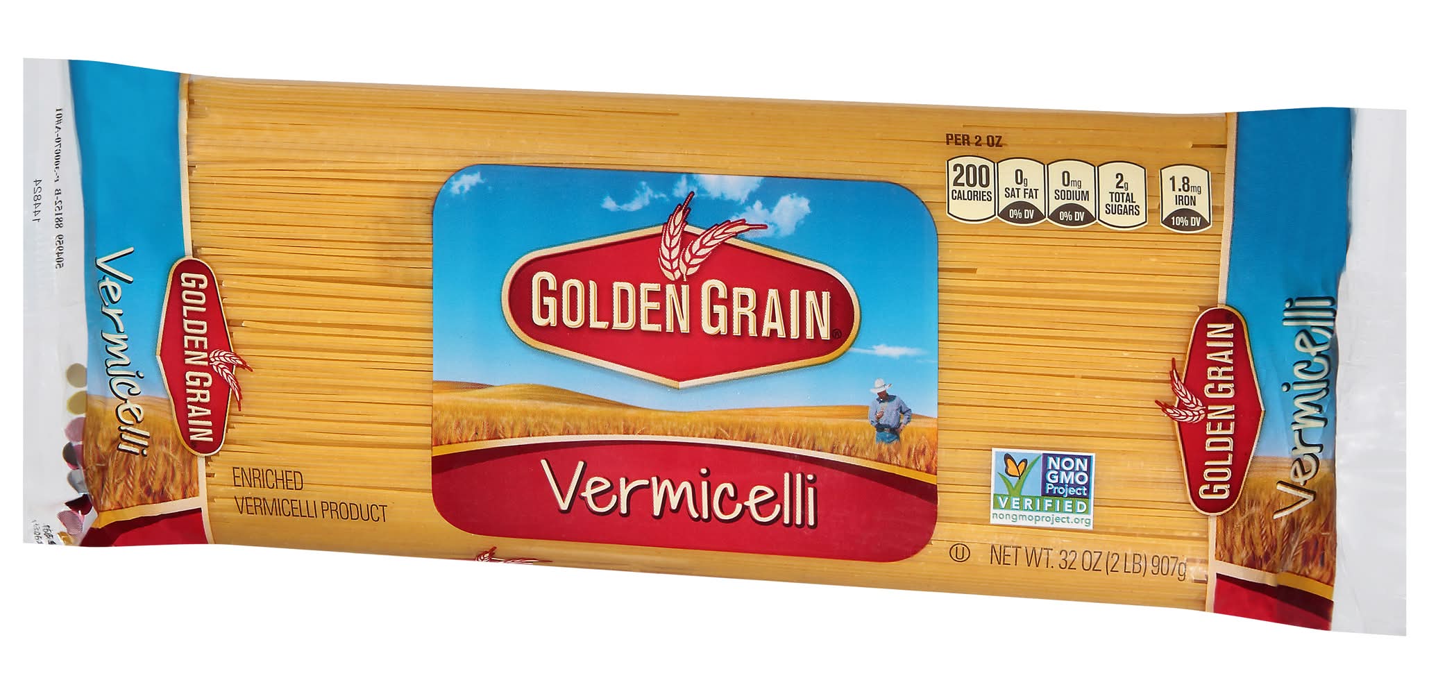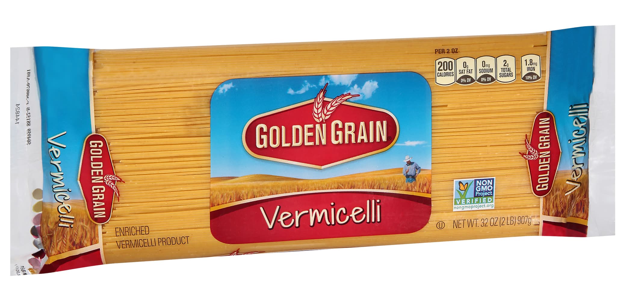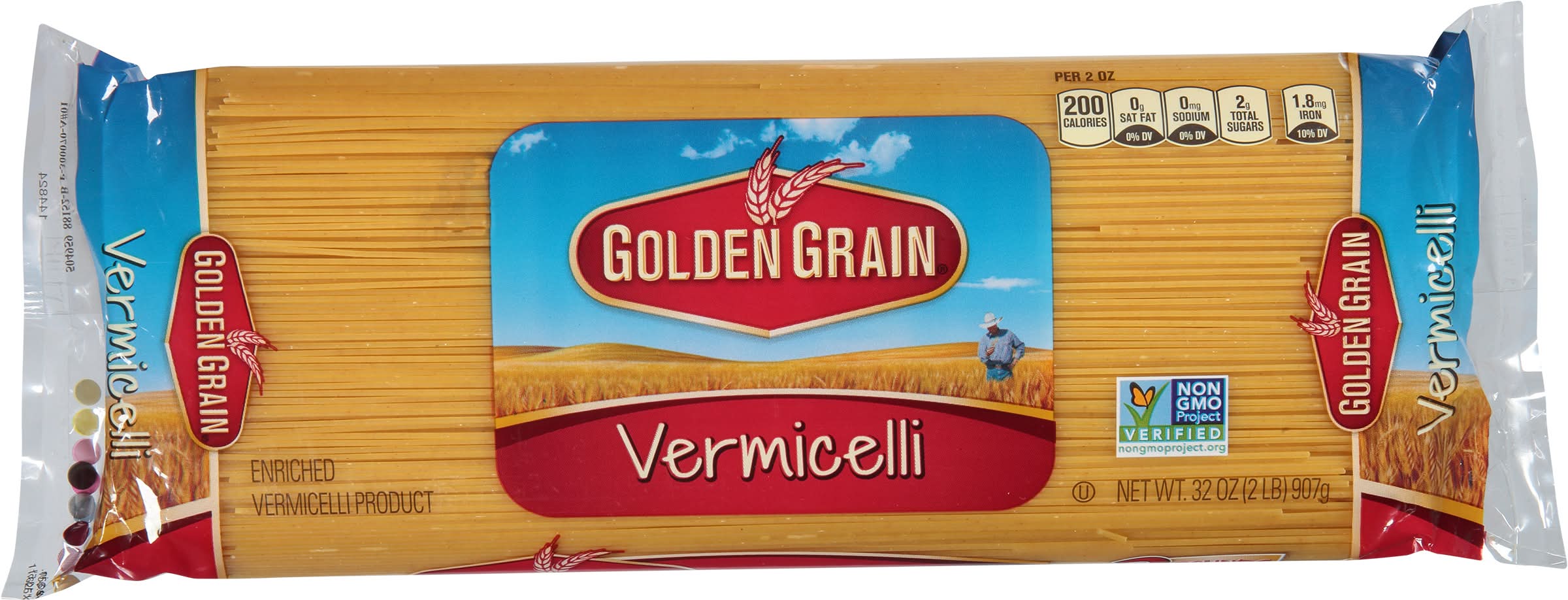 Enriched vermicelli product. Per 2 Oz: 200 calories; 0 sat fat (0% DV); 0 mg sodium (0% DV); 2 g total sugars; 1.8 mg iron (10% DV). Non GMO Project verified. nongmoproject.org. A Classic American Story: In 1912, Charlie and Maria DeDomenico started the Gragnano Products pasta factory in San Francisco's Mission District. Twenty years later, they changed the name to the Golden Grain Macaroni Company. Ever since, generations have trusted Golden Grain for high quality ingredients to make great tasting pasta for classic American pasta meals and noodle dishes. GoldenGrainPasta.com. Comments or questions, please call 877-Eat-pasta (877-328-7278). Bay Valley Foods, LLC,