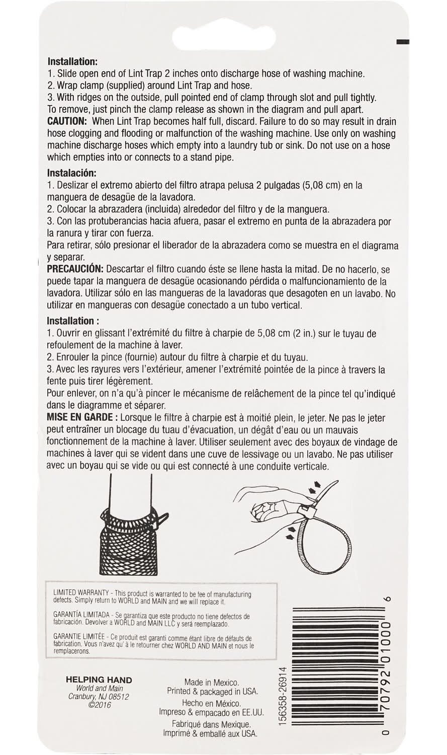 Installation: 1. slide open end of lint trap 2 inches onto discharge hose of washing machine. 2. wrap clamp (supplied) around lint trap and hose. 3. with ridges on the outside, pull pointed end of clamp through slot and pull tightly. to remove, just pinch the clamp release as shown in the diagram and pull apart.
