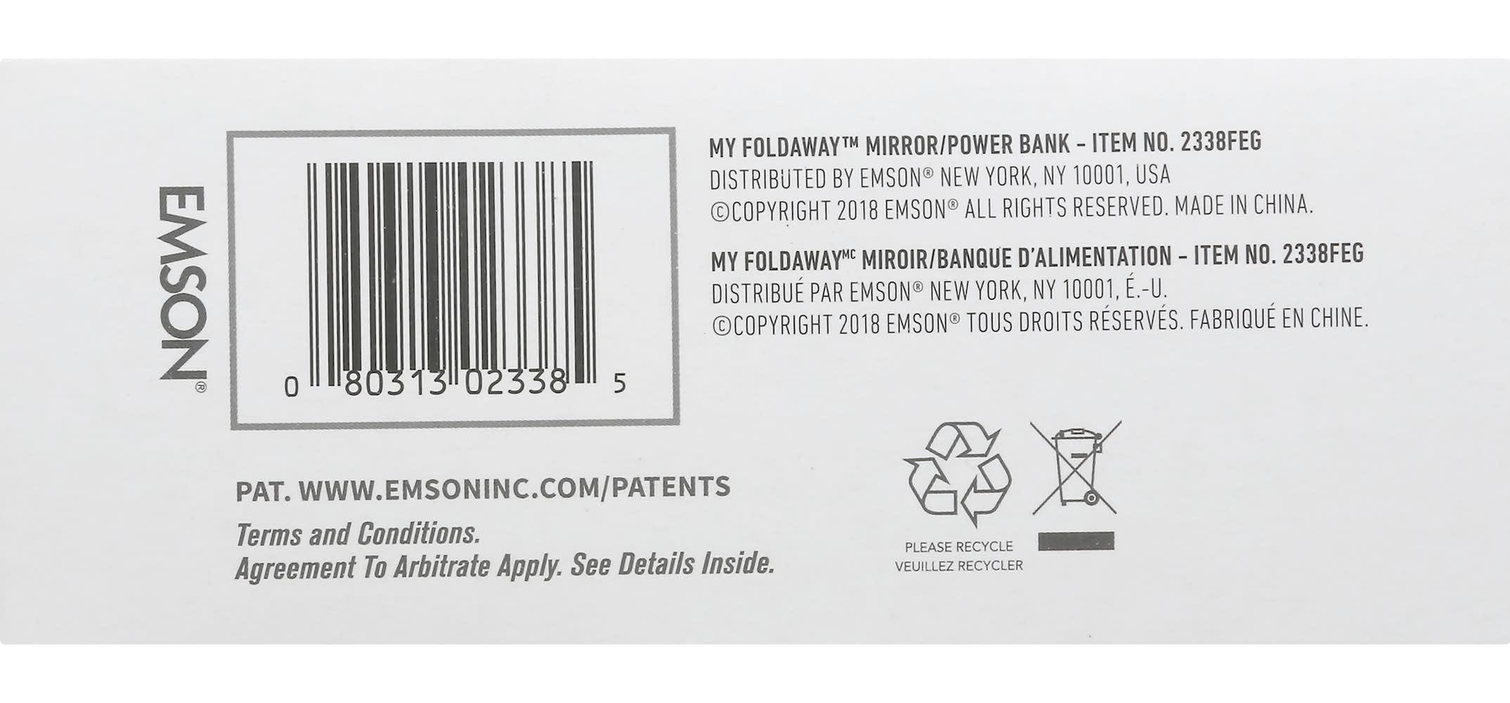 Includes: Micro USB cable. As soon on TV. 5x magnification. Charges your phone! 1x magnification. 3000 mAh 5V-1A Output. Charging time: 4 hrs. Lasting Time: 2.5 hrs. LED light-up mirror for day/night. Charges your phone anywhere. Folds flat with magnet. Terms and conditions. Agreement to arbitrate apply. See details inside. Please recycle. Made in China. • EMSON, • Packaging: Reusable