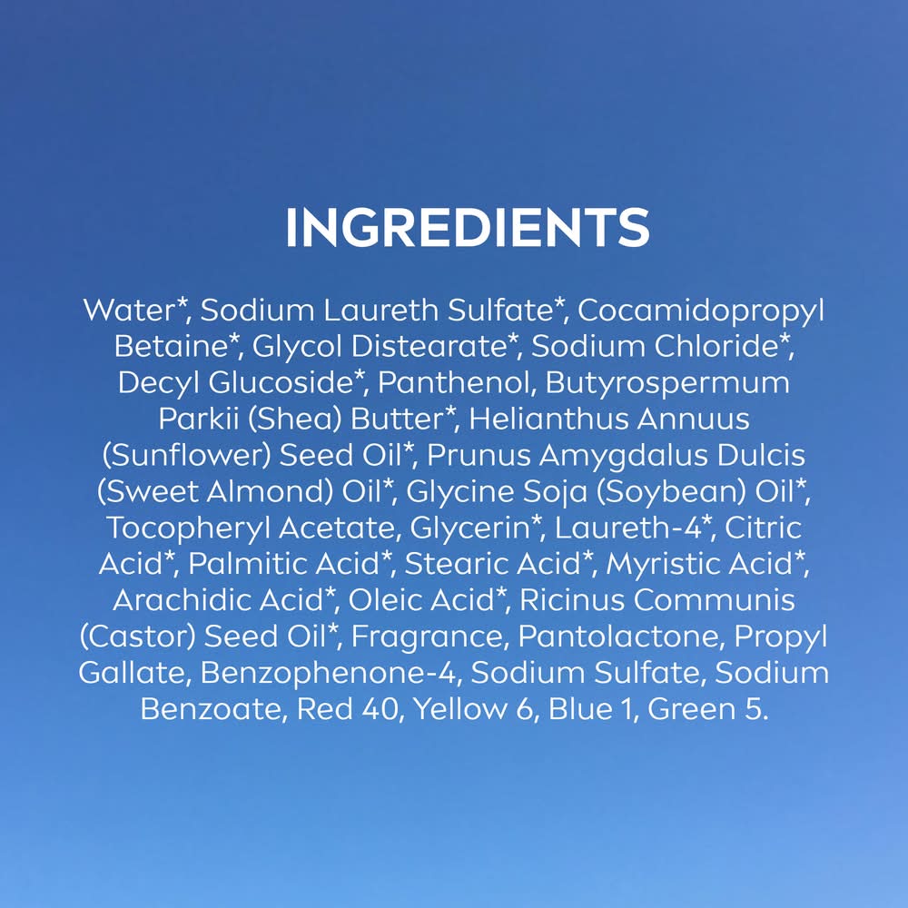 Ingredients: Water*, Sodium Laureth Sulfate*, Cocamidopropyl Betaine*, Glycol Distearate*, Sodium Chloride*, Decyl Glucoside*, Panthenol, Butyrospermum Parkii (Shea) Butter*, Helianthus Annuus (Sunflower) Seed Oil*, Prunus Amygdalus Dulcis (Sweet Almond) Oil*, Glycine Soja (Soybean) Oil*, Tocopheryl Acetate, Glycerin*, Laureth-4*, Citric Acid*, Palmitic Acid*, Stearic Acid*, Myristic Acid*, Arachidic Acid*, Oleic Acid*, Ricinus Communis (Castor) Seed Oil*, Fragrance, Pantolactone, Propyl Gallate, Benzophenone-4, Sodium Sulfate, Sodium Benzoate, Red 40, Yellow 6, Blue 1, Green 5.
