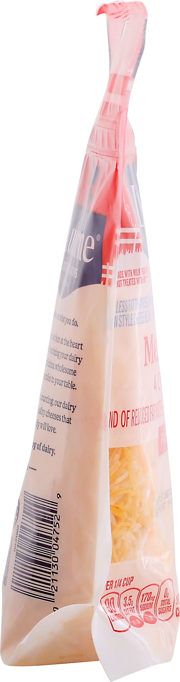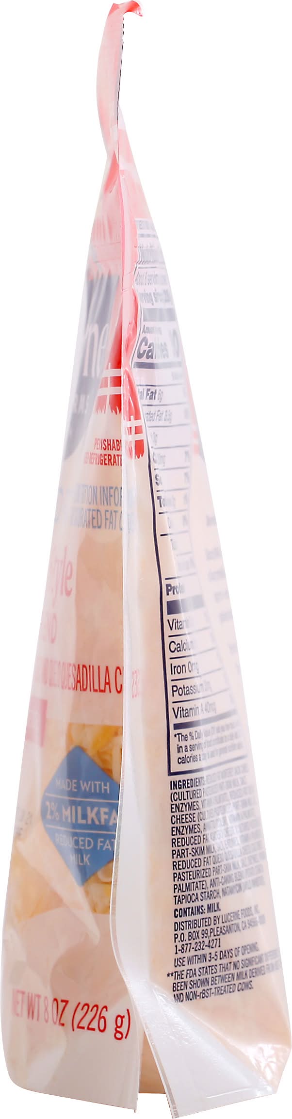 Reduced Fat Monterey Cheese (Pasteurized Part-Skim Milk, Cheese Culture, Salt, Enzymes, Vitamin A Palmitate, ), Reduced Fat Cheddar Cheese (Pasteurized Part-Skim Milk, Cheese Culture, Salt, Enzymes, Annatto [Vegetable Color], Vitamin A Palmitate), Reduced Fat Queso Quesadilla Cheese (Pasteurized Part-Skim Milk, Cheese Culture, Salt, Enzymes, Vitamin A Palmitate), Anti-Caking Blend (Potato Starch, Corn Starch, Calcium Sulfate, Natamycin [Mold Inhibitor]). Contains: Milk