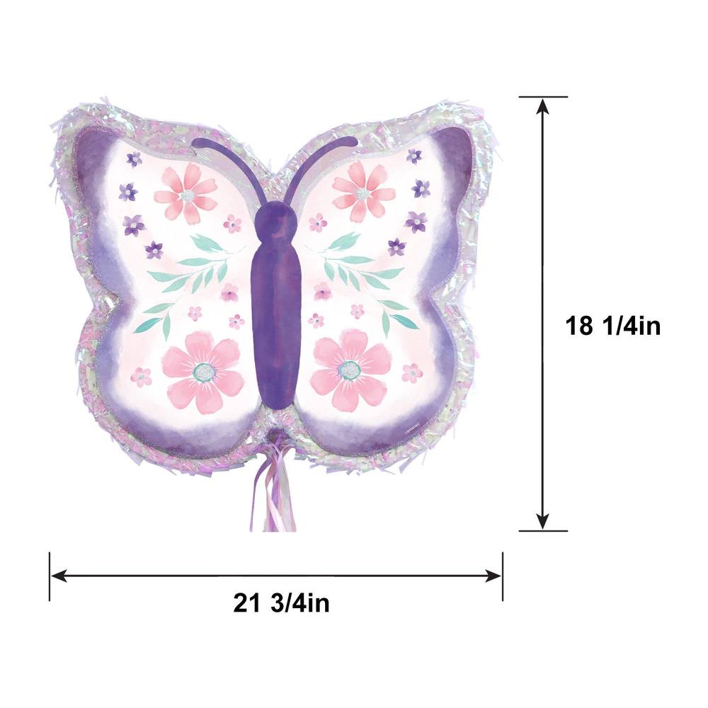 Keep guests busy at your garden party with a butterfly pinata! The pull-string pinata is a purple butterfly with green and pink accents and an eye-catching iridescent border. Fill the pinata with party favors and candy, hang it by the attached strong plastic loop, and let guests take turns pulling the strings on the bottom until the trap door releases its contents. Or, guests can open it the traditional way with a bat and blindfold (sold separately). pbIridescent Pull String Flutter Pinata product details:21 3/4in wide x 3in long x 18 1/4in tall .Holds up to 2lb of pinata filler .Pinata filler, bat, and blindfold sold separately.