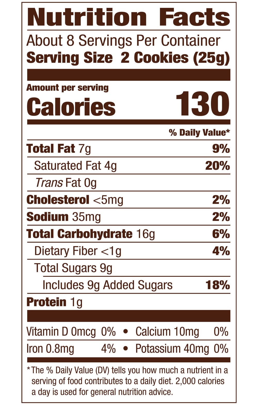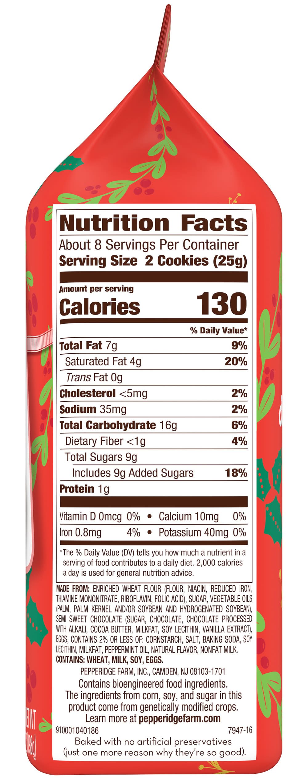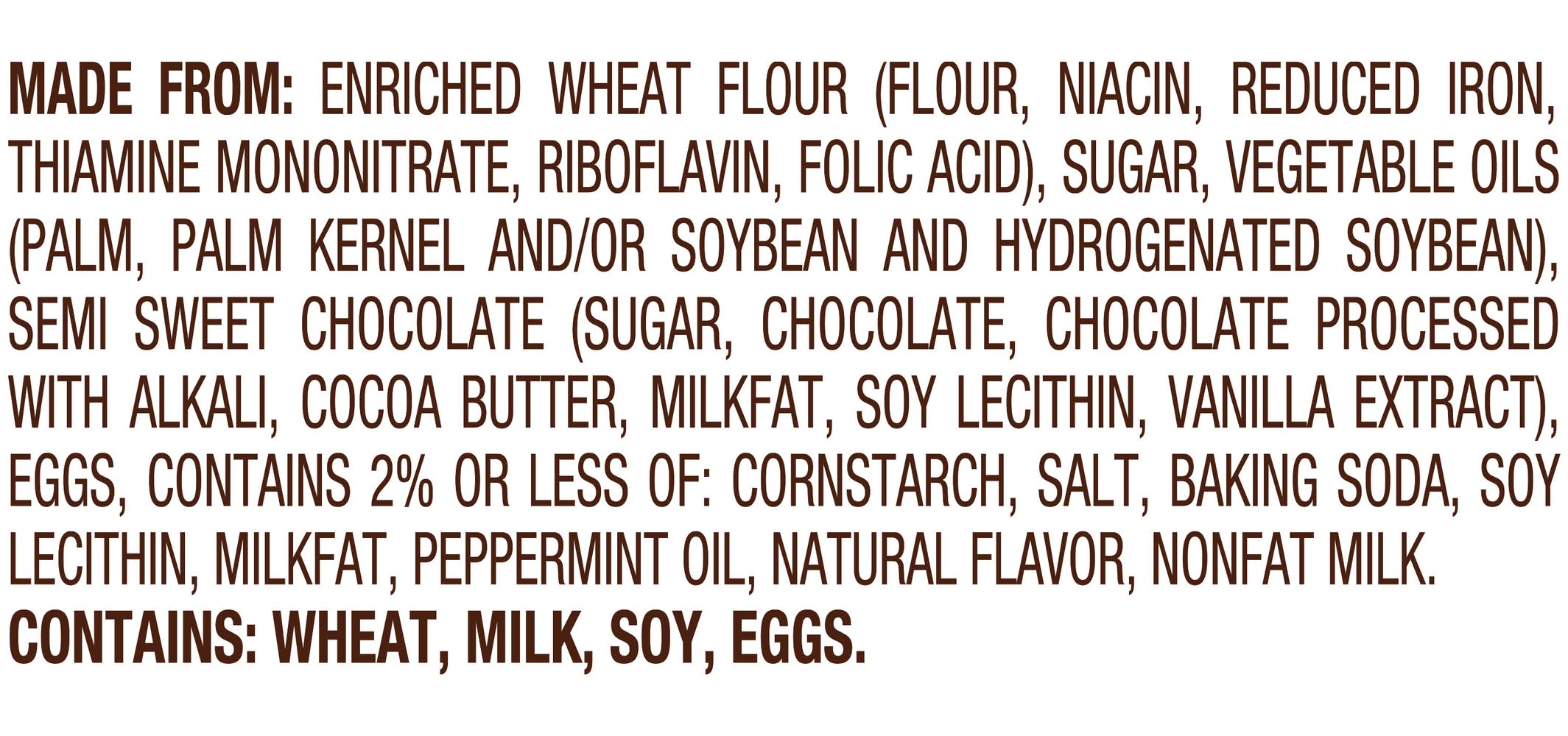 Ingredients: MADE FROM: ENRICHED WHEAT FLOUR (FLOUR, NIACIN, REDUCED IRON, THIAMINE MONONITRATE, RIBOFLAVIN, FOLIC ACID), SUGAR, VEGETABLE OILS (PALM, PALM KERNEL AND/OR SOYBEAN AND HYDROGENATED SOYBEAN), SEMI SWEET CHOCOLATE (SUGAR, CHOCOLATE, CHOCOLATE PROCESSED WITH ALKALI, COCOA BUTTER, MILKFAT, SOY LECITHIN, VANILLA EXTRACT), EGGS, CONTAINS 2% OR LESS OF: CORNSTARCH, SALT, BAKING SODA, SOY LECITHIN, MILKFAT, PEPPERMINT OIL, NATURAL FLAVOR, NONFAT MILK. CONTAINS: WHEAT, MILK, SOY, EGGS. Contains: Wheat, Eggs, Soybeans, Milk, Corn