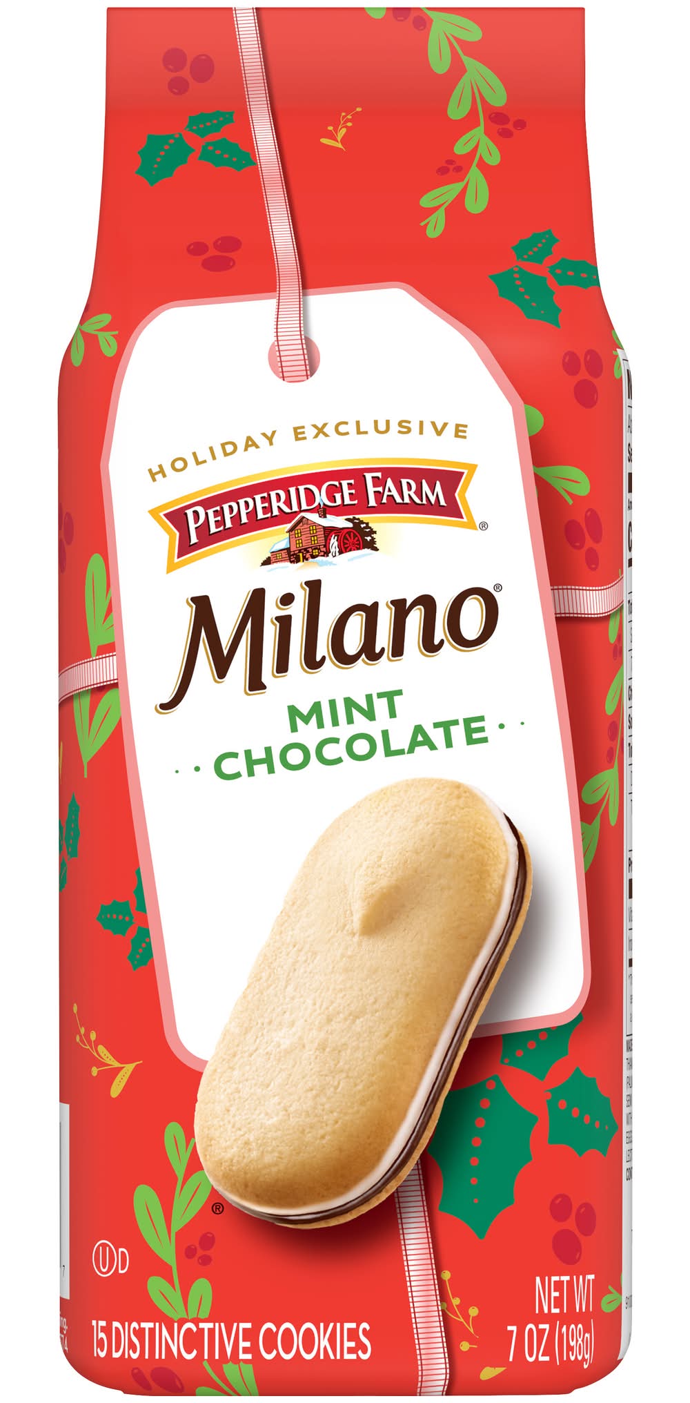 Elevate any moment with Pepperidge Farm Milano Mint Chocolate Cookies. Delicate, sweet and oh so indulgent, these chocolate mint cookies feature rich dark chocolate and refreshing mint between two crisp baked cookies. With festive holiday packaging, Milano Mint Chocolate Cookies are perfect for sharing and gifting. Grab this limited-edition bag of cookies and celebrate all season long. • Flavor: Mint chocolate • Pepperidge Farm, Inc., Norwalk, CT, 06856 • Packaging: Reusable