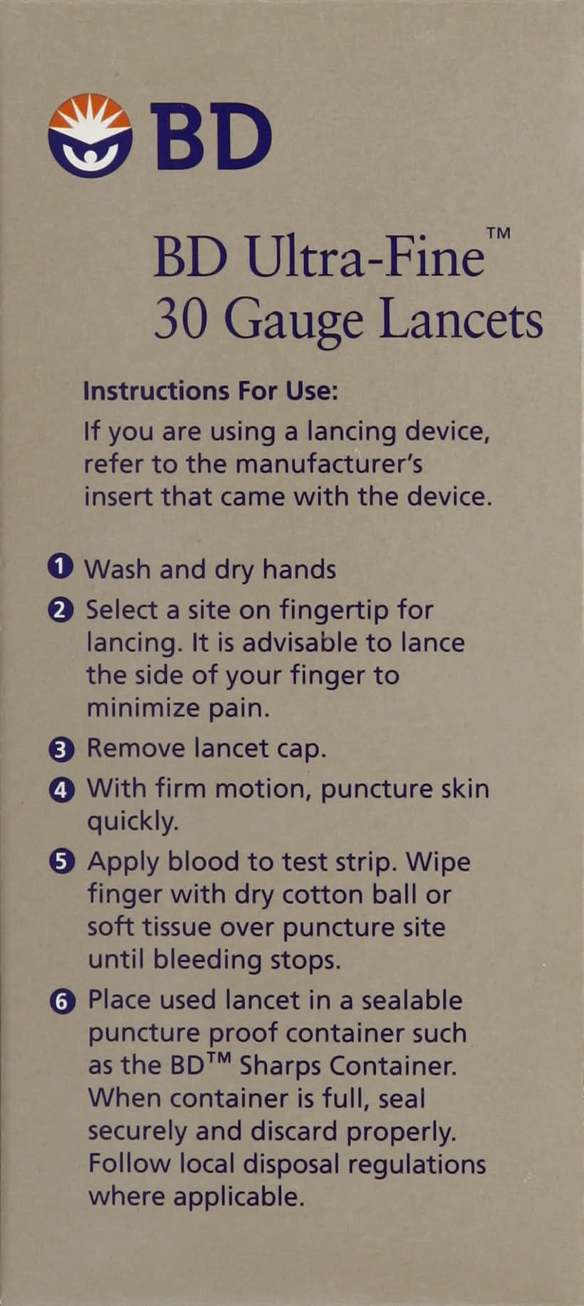Directions: If you are using a lancet device, refer to the manufacturer's insert that came with the device. 1. Wash and dry hands. 2. Select fingertip site slightly off-center to minimize discomfort. 3. Remove lancet cap. 4. With firm motion, puncture skin quickly. 5. Apply blood to test strip, wipe fingertip with dry cotton ball or soft tissue, holding over puncture site until bleeding stops. 6. Place used lancet in a sealed puncture proof container. When container is full, follow local disposal ordinance where applicable.