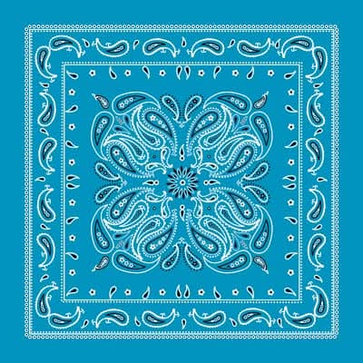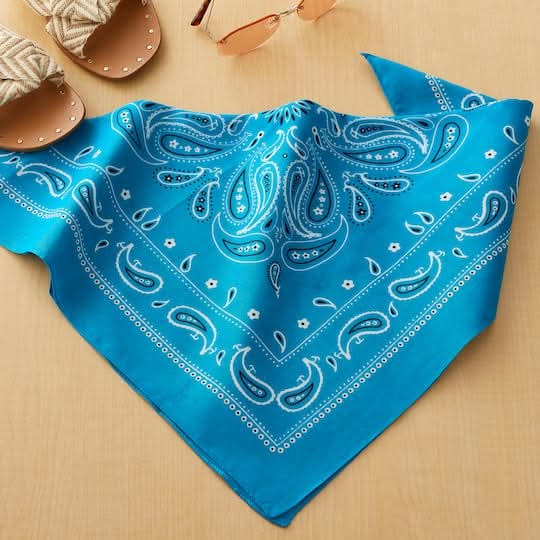 Use it as a head covering, scarf, or headband. Try dressing up your dog's collar or use a bunch for a western-themed party. Add extra special bling by decorating one with rhinestones and studs. Available in multiple colors. 21" x 21" (53.3cm x 53.3cm). Lightweight. 100% cotton • Color: Turquoise • Size: 21" x 21"