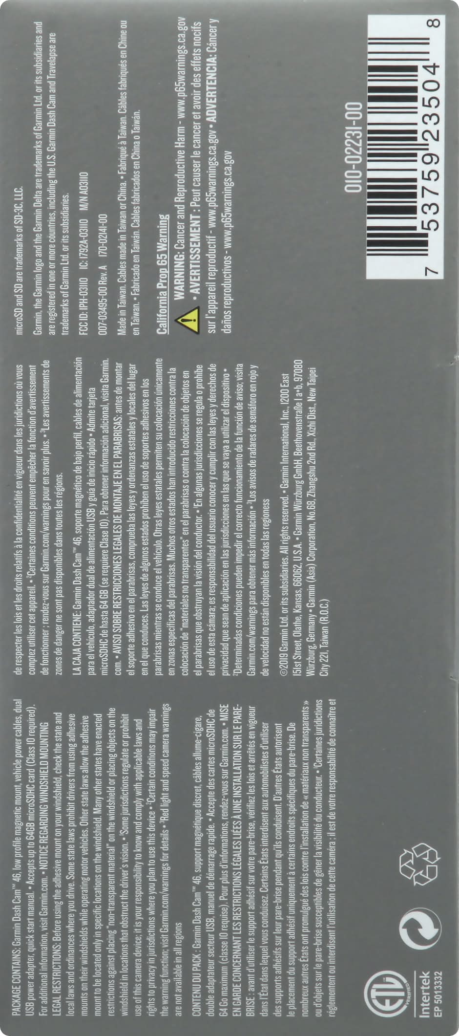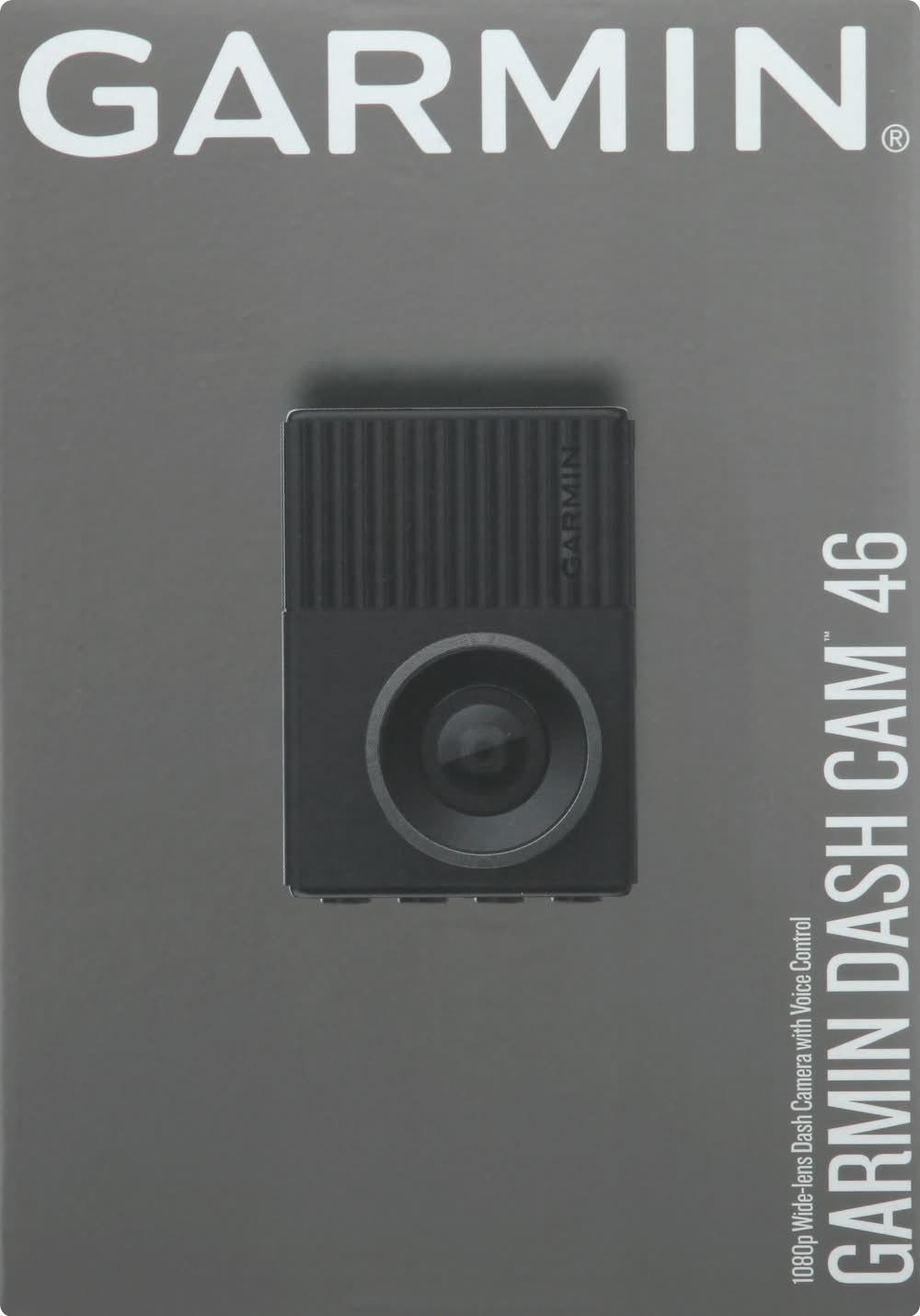 1080p wide-lens dash camera with voice control. High-quality, 140 degrees, wide-angle field of view with 1080p footage. Voice-controlled dash cam (Some jurisdictions regulate or prohibit use of this camera device; it is your responsibility to know and comply with applicable laws and rights to privacy in jurisdictions where you plan to use this device) featuring a wide-angle lens, driver alerts and compact design. 1080p video capture. Forward collision and lane departure alerts (Certain conditions may impair the warning function; visit Garmin.com/warnings for details). Red light and speed cameras (Red light and speed camera warnings are not available in all regions). Travelapse. GPS-enabled with automatic incident detection. 140 degrees wide field of view. Includes: Dual USB power adapter. Package Contains: Garmin Dash Cam 46, low profile magnetic mount, vehicle power cables, dual USB power adapter, quick start manual. Accepts up to 64gb microSDHC card (class 10 required). ETL verified - Intertek. Garmin.com For additional information, visit Garmin.com. Made in Taiwan. Cables are made in Taiwan or China.