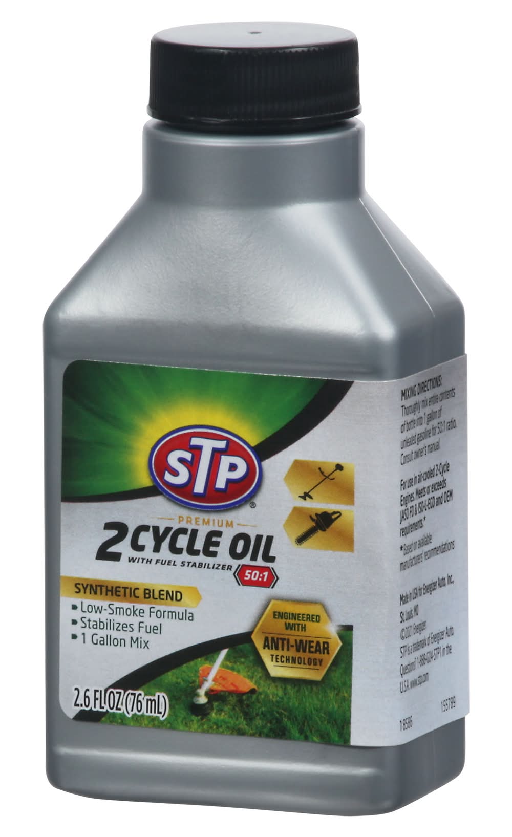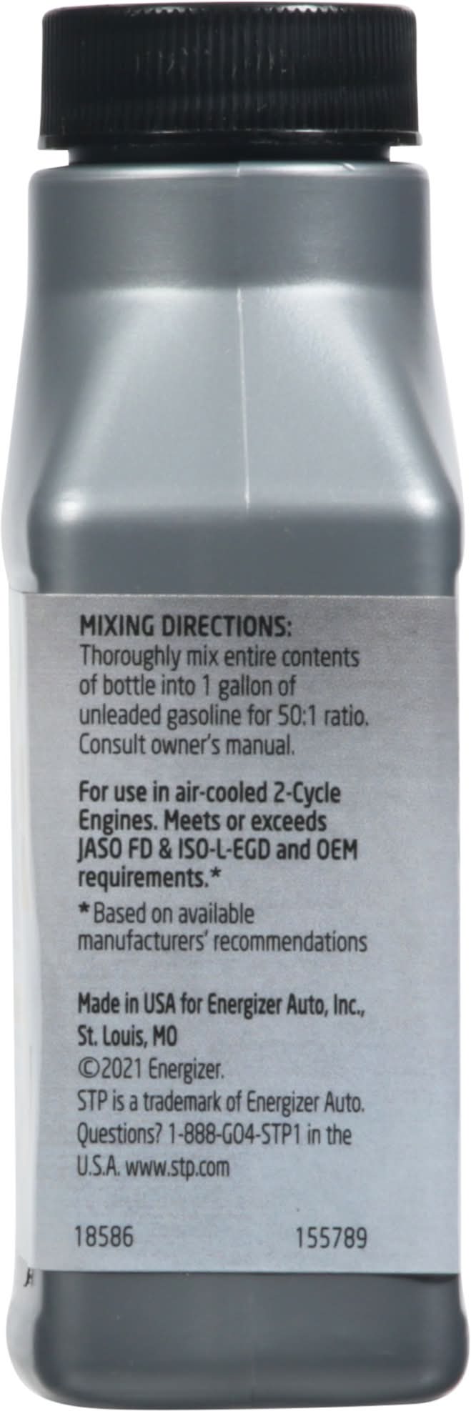 Synthetic blend. Low-smoke formula. Stabilizes fuel. 1 Gallon mix. Engineered with anti-wear technology. Helps maintain maximum performance in 50:1 2-cycle small engines. Synthetic Blend Oil: Provides enhanced engine lubrication. Reduces exhaust smoke. Detergents help keep engine components clean, prevent ring sticking, and control carbon deposits. Anti-wear technology provides a layer of protection between moving metal parts. Fuel stabilizer keeps fuel fresh during infrequent use. 100% satisfaction guarantee or your money back. www.stp.com. Questions? 1-888-GO4-STP1 in the USA. www.stp.com. Made in USA for energizer Auto, Inc. Energizer Auto, Inc.,