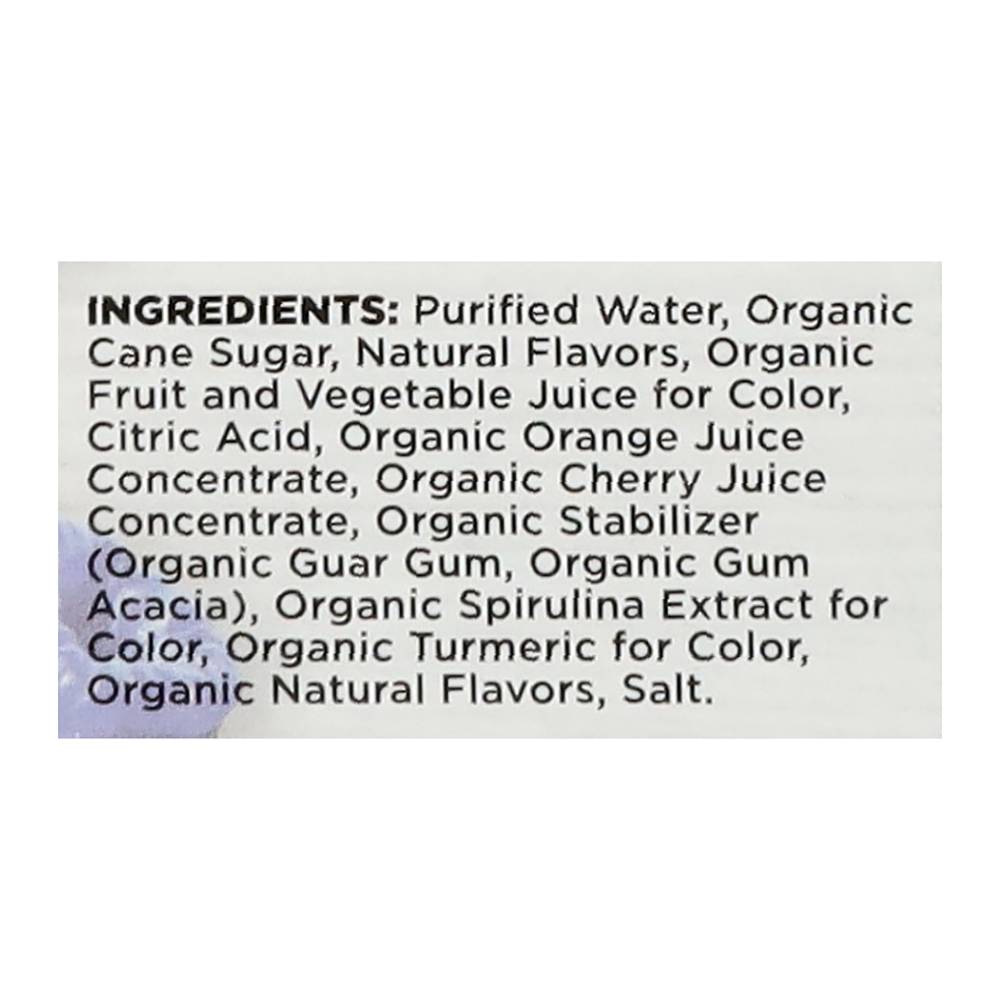 Ingredients: Purified Water, Organic Cane Sugar, Organic Natural Flavors, Organic Fruit and Vegetable for Color, Citric Acid, Organic Orange Juice Concentrate, Organic Cherry Juice Concentrate, Organic Stabilizer (Organic Guar Gum, Organic Gum Acacia), Organic Spirulina Extract for Color, Organic Turmeric for Color, Organic Natural Flavors, Salt Contains: Milk, Tree Nuts, Coconuts, Soybeans