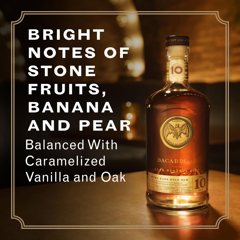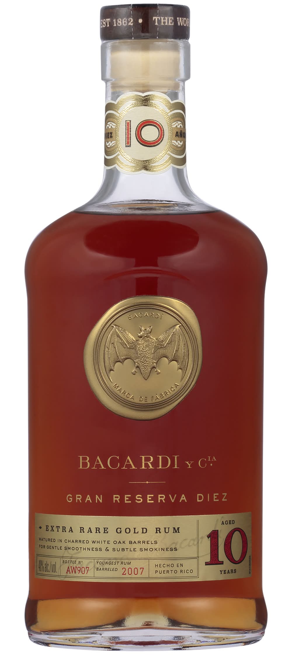 Expertly blended by the Maestros de Ron Bacard, BACARD Gran Reserva Diez is aged for a minimum of 10 years in American White Oak barrels using the undisturbed aging process, in which rum bases are barrel-aged without being disturbed - no tapping, refilling or blending in the barrel. It is then filtered for a smooth finish. BACARD Gran Reserva Diez dark gold rum is worth the wait. • Alcohol by volume: 40% • Bacardi Corporation, Catano, PR, 00962