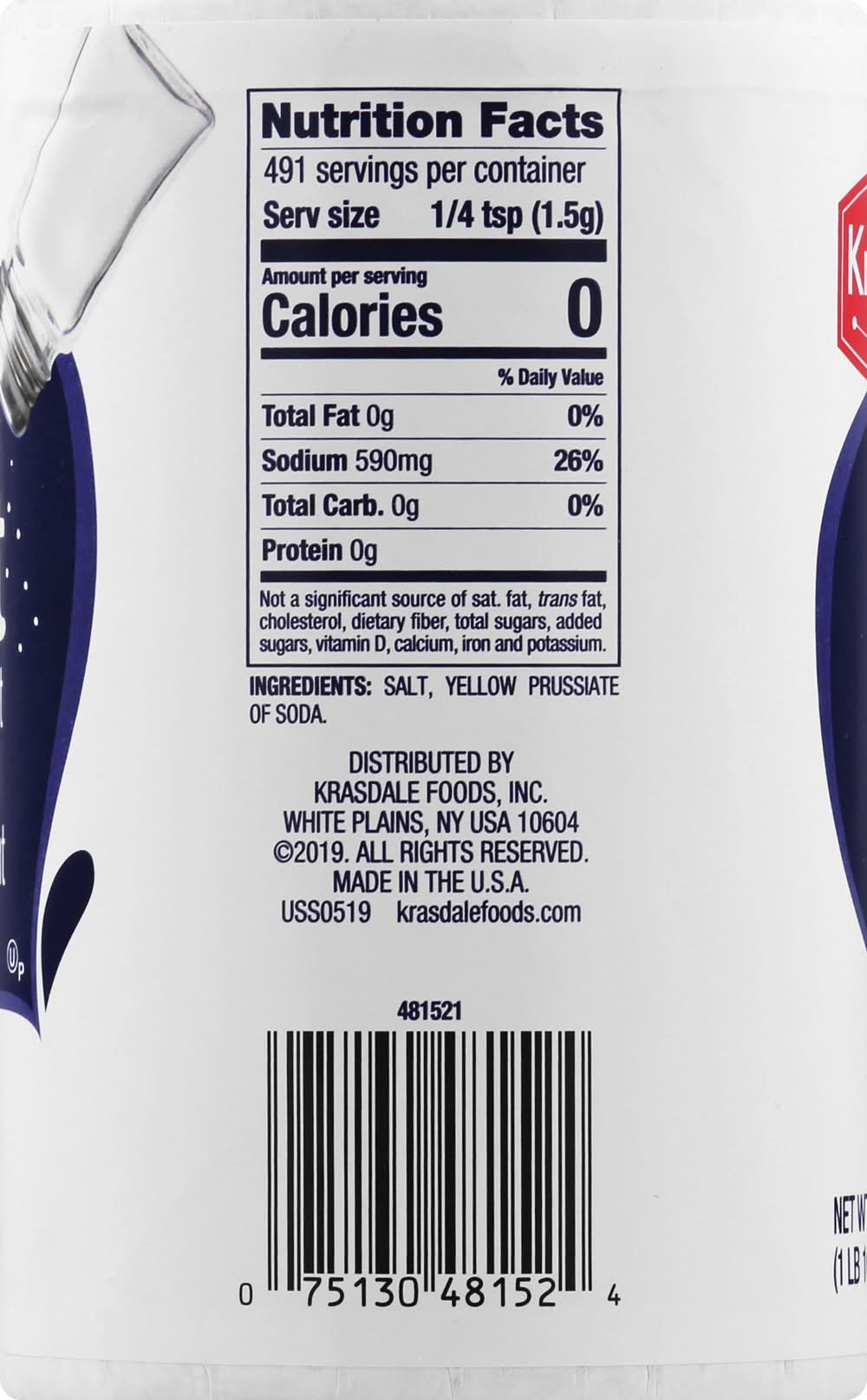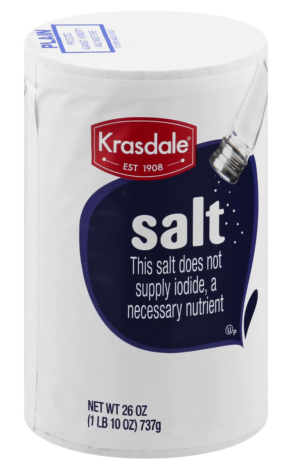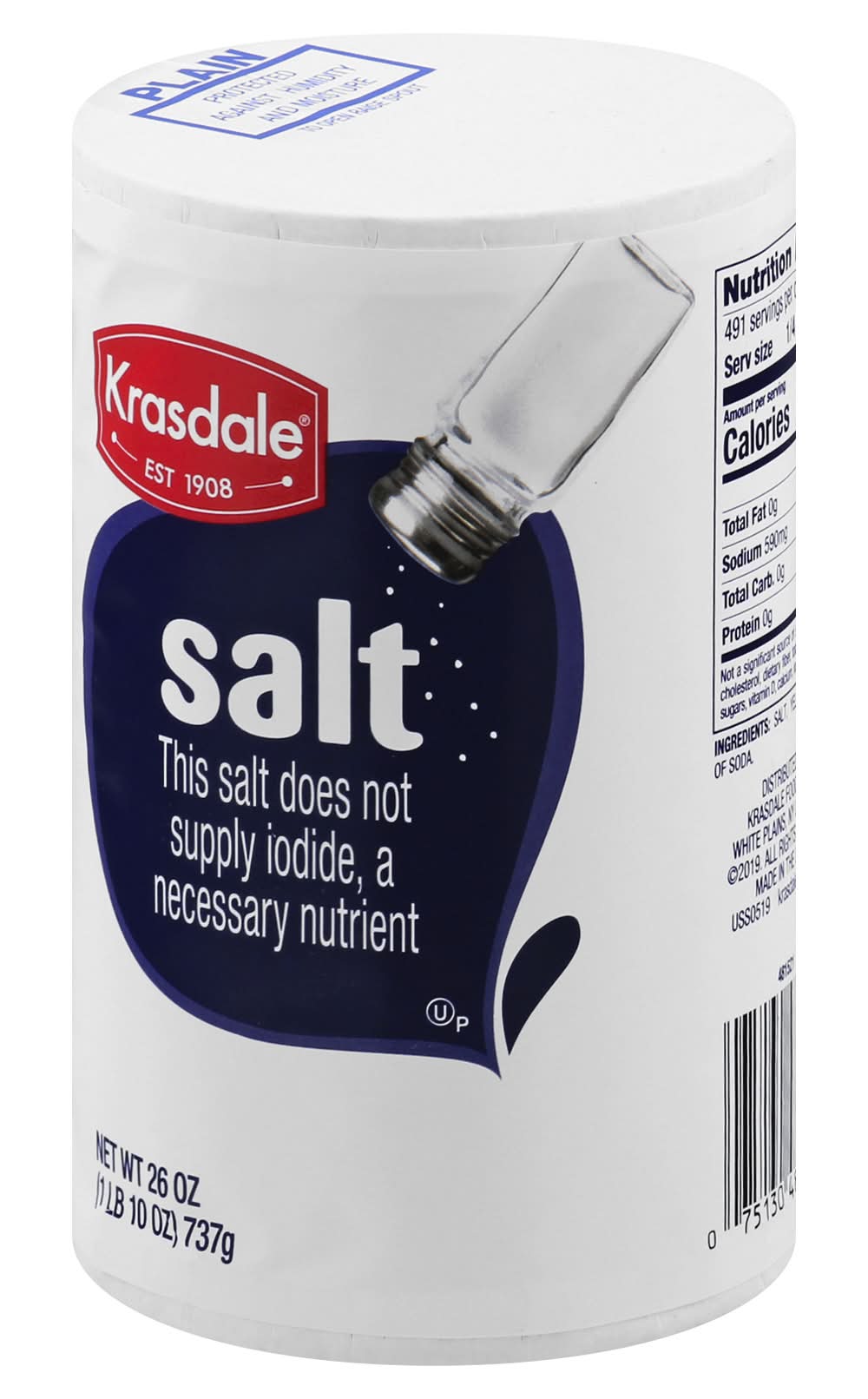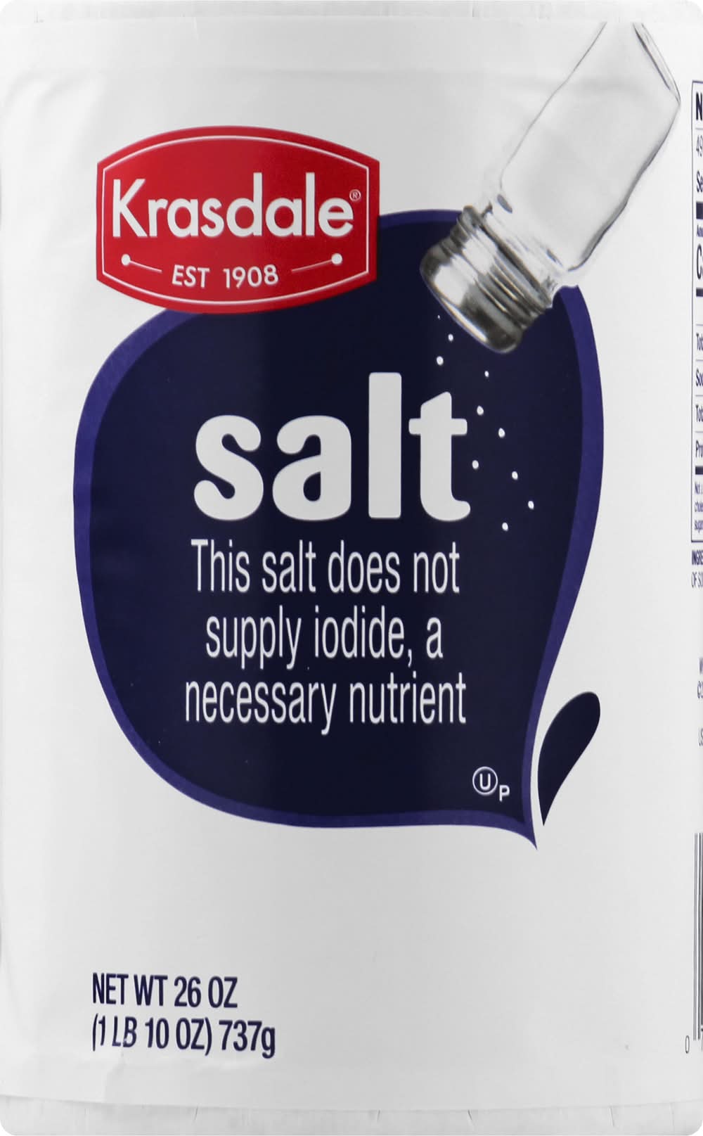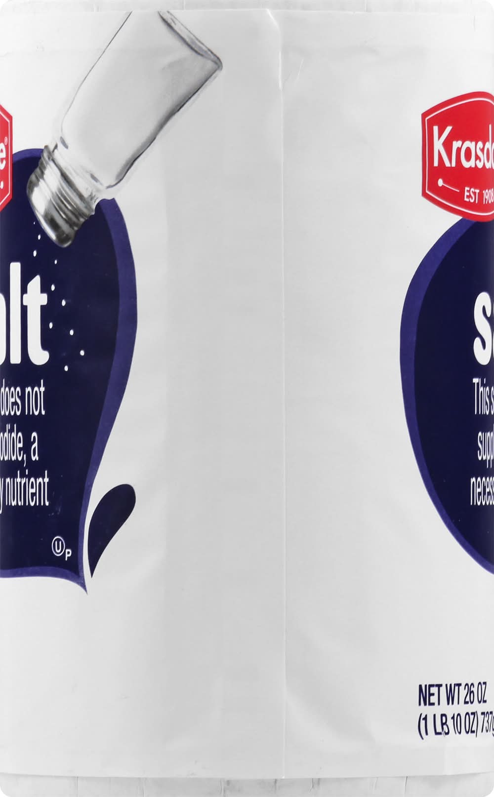 Est 1908. This salt does not supplies iodide, a necessary nutrient. Protected againts humidity and moisture. krasdalefoods.com. Made in the USA. Krasdale Foods,