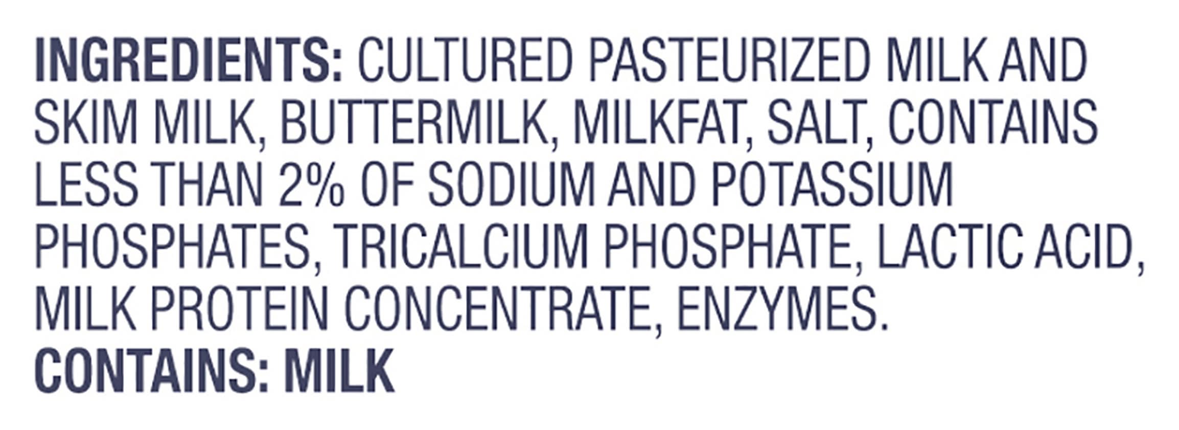 Ingredients: Cultured Pasteurized Milk and Skim Milk, Buttermilk, Milkfat, Salt, Contains Less than 2% of Sodium and Potassium Phosphates, Tricalcium Phosphate, Lactic Acid, Milk Protein Concentrate, Enzymes Contains: Milk