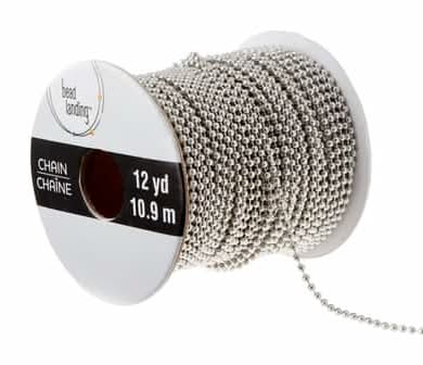 Ball chains are highly versatile. They are great for making necklaces, bracelets, key chains, ceiling fan pulls and much more. Cut the chain to the length you need, attach one of the four included clasps and it's ready for you to use. Rhodium-plated brass chain. 2 mm wide. Includes 4 closures. Nickel free. Bead Landing Ball Chain Spool.