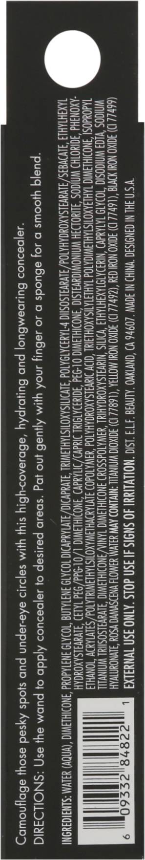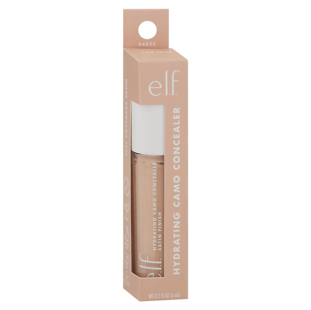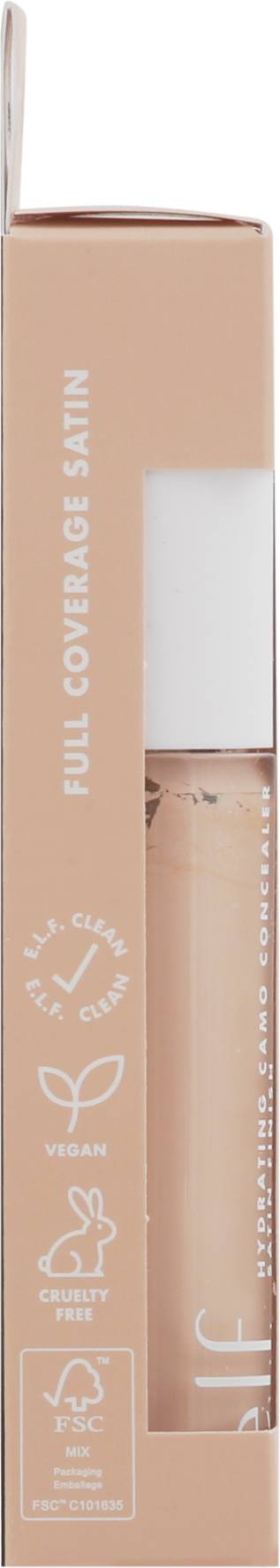 Vegan. Camouflage those pesky spots and under-eye circles with this high-coverage, hydrating and longwearing concealer. Full coverage satin. Elf clean. Oversized doe foot to conceal, contour & highlight. elfcosmetics.com. (hashtag)eyeslipsface. FSC: Mix - Packaging. Cruelty free. Made in China. Designed in the USA. Color: Fair beige