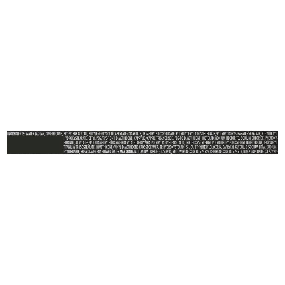 Ingredients: Water (Aqua), Dimethicone, Propylene Glycol, Butylene Glycol Dicaprylate/Dicaprate, Trimethylsiloxysilicate, Polyglyceryl-4 Diisostearate/Polyhydroxystearate/Sebacate, Ethylhexyl Hydroxystearate, Cetyl PEG/PPG-10/1 Dimethicone, Caprylic/Capric Triglyceride, PEG-10 Dimethicone, Disteardimonium Hectorite, Sodium Chloride, Phenoxyethanol, Acrylates/Polytrimethylsiloxymethacrylate Copolymer, Polyhydroxystearic Acid, Triethoxysilylethyl Polydimethylsiloxyethyl Dimethicone, Isopropyltitanium Trisostearate, Dimethicone/Vinyl Dimethicone Crosspolymer, Trihydroxystearin, Silica, Ethylhexylglycerin, Caprylyl Glycol, Disodium EDTA, Sodium Hyaluronate, Rosa Damascena Flower Water, May Contain: Titanium Dioxide (CI 77891), Yellow Iron Oxides (CI 77492), Red Iron Oxide (CI 77491), Black Iron Oxide (CI 77499)