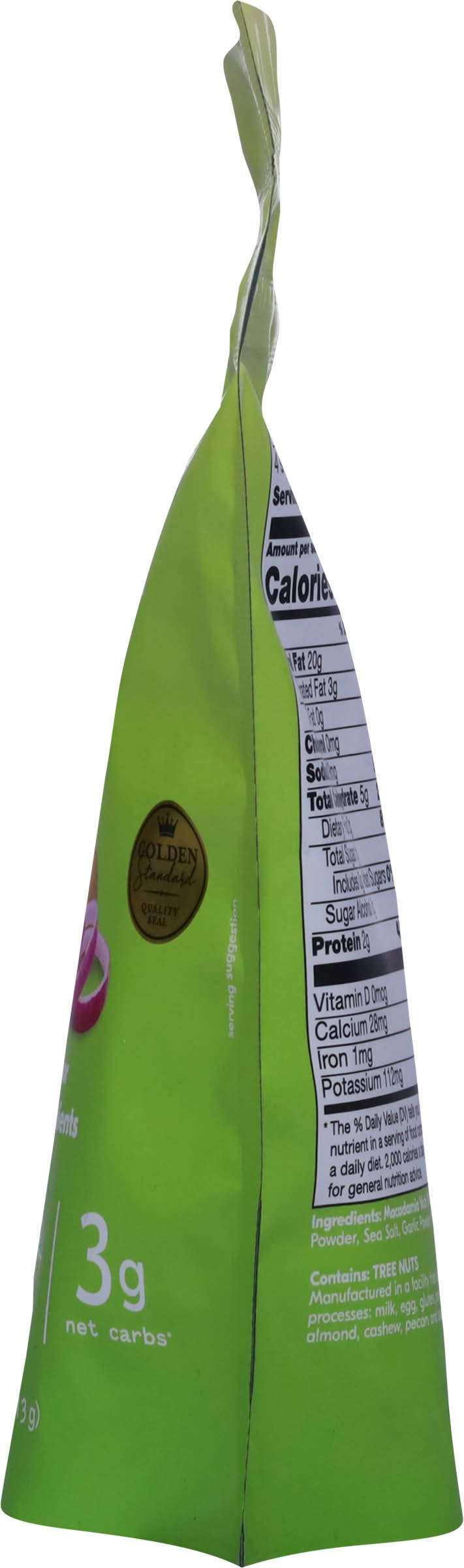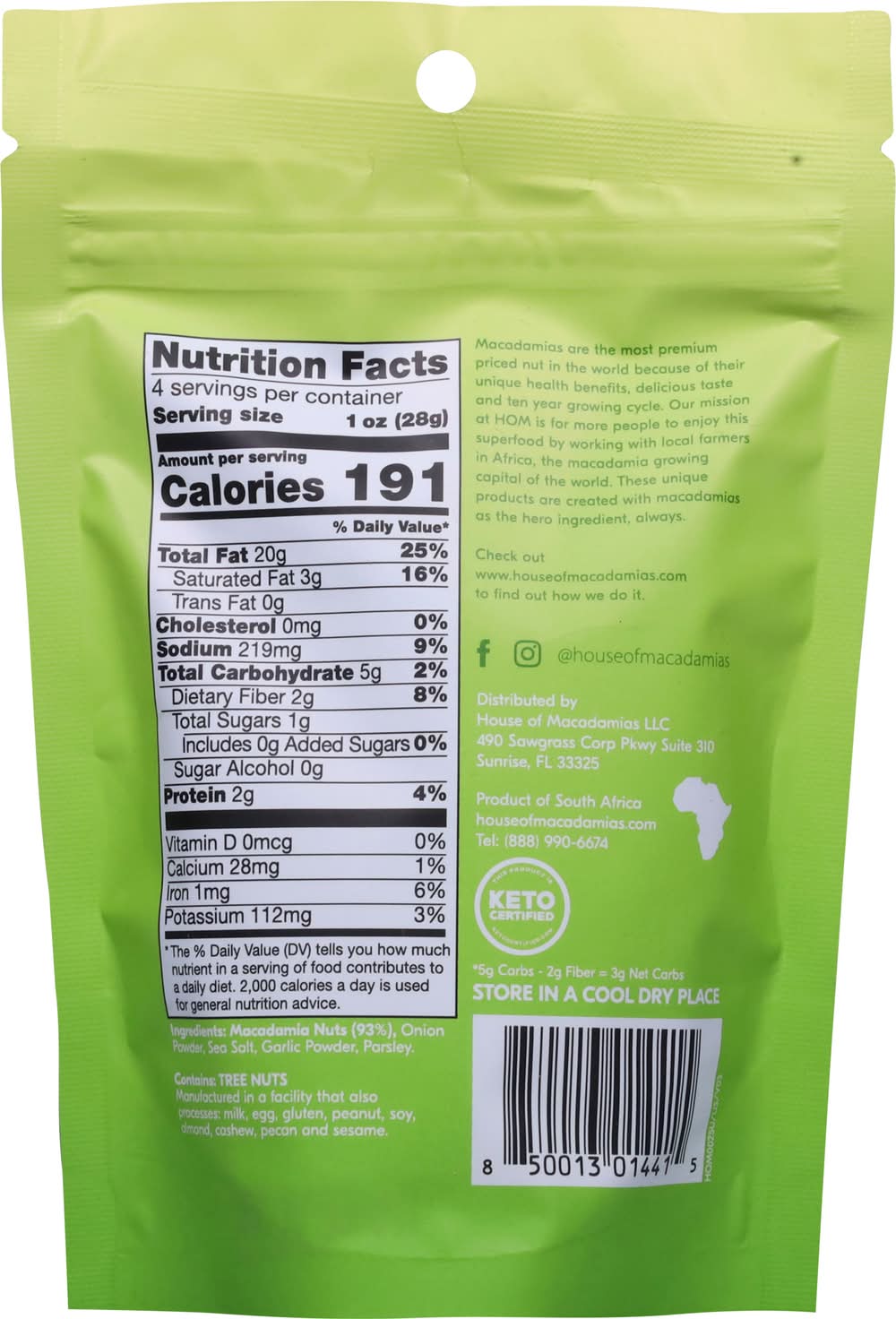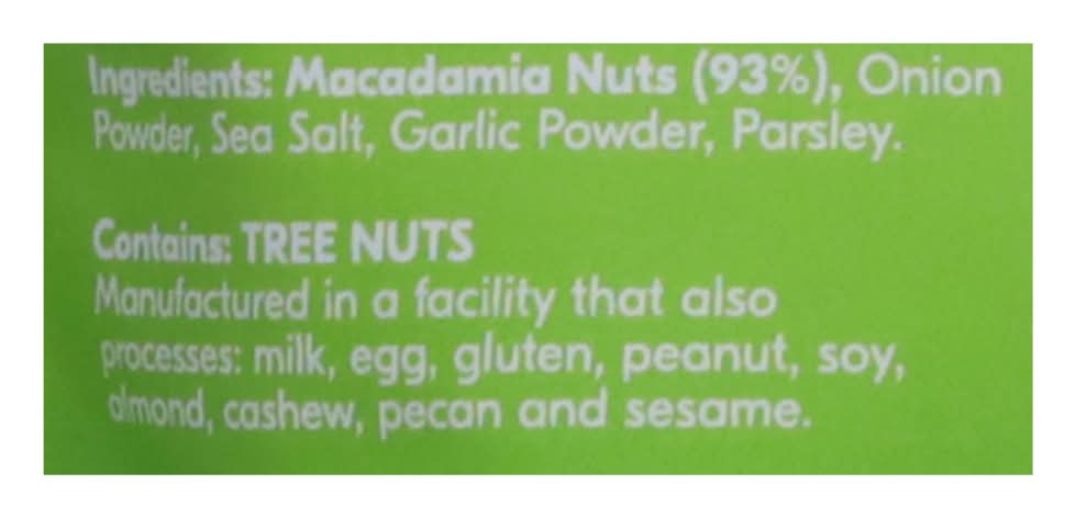 Macadamia Nuts (93%), Onion Powder, Sea Salt, Garlic Powder, Parsley Contains: Tree Nuts, Tree Nuts, Macadamia Nuts, Milk, Eggs, Gluten, Peanuts, Soybeans, Tree Nuts, Almonds, Tree Nuts, Cashews, Tree Nuts, Pecans, Sesame