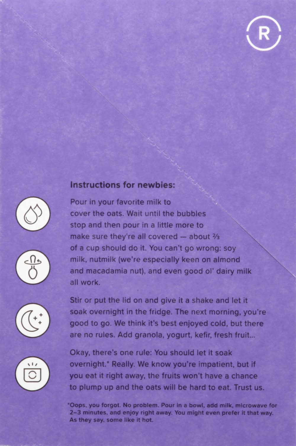 Directions for use: Directions: Instructions for newbies: Pour in your favorite milk to cover the oats. Wait until the bubbles stop and then pour in a little more to make sure they're all covered - about 2/3 of a cup should do it. You can't go wrong: soy milk, nutmilk (we're especially keen on almond and macadamia nut), and even good of dairy milk all work. Stir or put the lid on and give it a shake and let it soak overnight in the fridge. The next morning, you're good to go. We think it's best enjoyed cold, but there are no rules. Add granola, yogurt, kefir, fresh fruit - Okay, there's one rule: You should let it soak overnight. (Oops. you forgot. No problem. Pour in a bowl, add milk, microwave for 2-3 minutes. and enjoy right away. You might even prefer it that way. As they say, some like It hot). Really. We know you're impatient, but if you eat it right away, the fruits won't have a chance to plump up and the oats will be hard to eat. Trust us. Add milk. Stir/shake. Enjoy. Refrigerate overnight. You can buy this whole box (please do!) but not every store can scan this UPC. Ask them to scan the pouches inside. Thanks! Storage recommendation: Refrigerate overnight.
