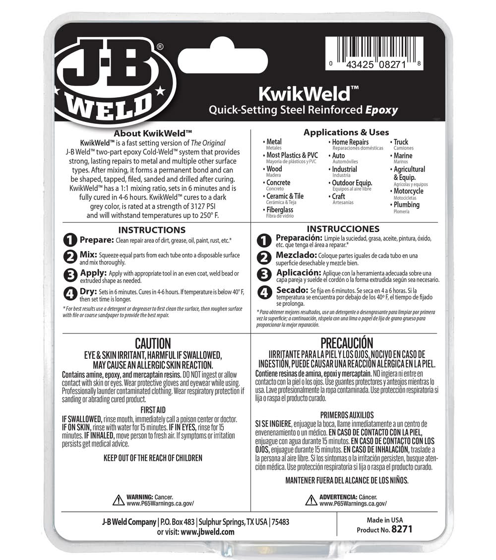 J-B Weld KwikWeld is a fast setting version of The Original J-B Weld 2-part epoxy cold weld system that provides strong, lasting repairs to metal and multiple other surface types. After mixing, it forms a permanent bond and can be shaped, tapped, filed, sanded and drilled after curing. J-B KwikWeld has a 1:1 mixing ratio, sets in 6 This product contains a chemical known to the State of California to cause cancer, birth defects or other reproductive harm. For more information, go to www.P65Warnings.ca.gov.