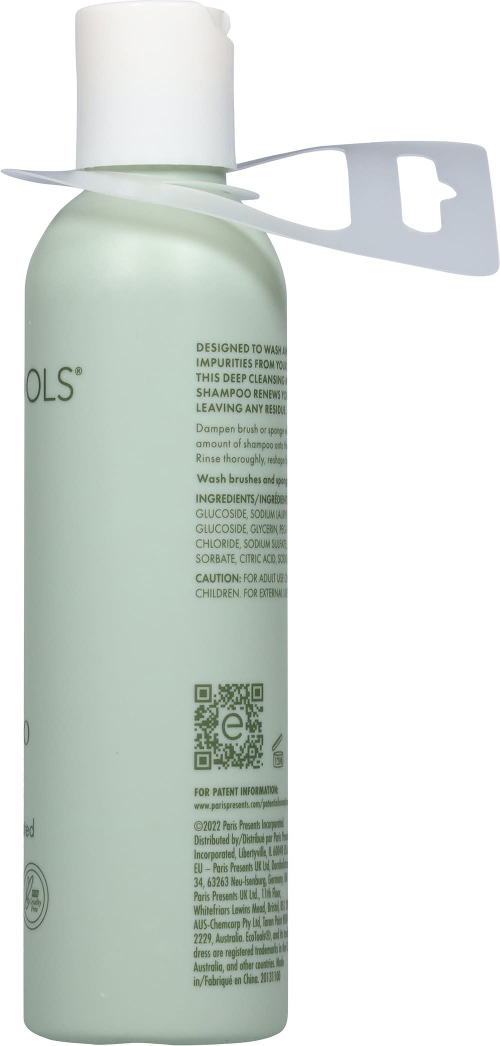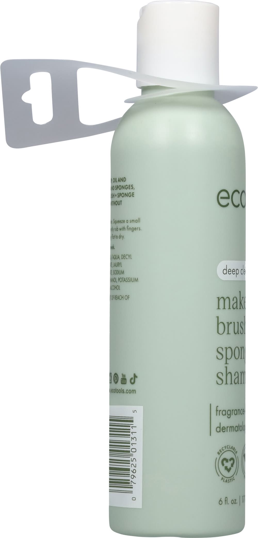 Removes more than 90% of makeup! (laboratory tested and proven using a leading water-based foundation). Deep clean. Fragrance-free. Dermatologist tested. Designed to wash away makeup, oil and impurities from your brushes and sponges, this deep cleansing makeup brush + sponge shampoo renews your tools without leaving any residue. www.ecotools.com. Facebook. Instagram. Pinterest. YouTube. Tik Tok. Recyclable plastic. PeTA - Cruelty free. Made in China. Packaging: Reusable