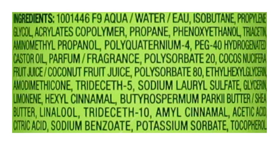 Ingredients: Aqua/Water/Eau Isobutane Propylene Glycol Acrylates Copolymer Propane Phenoxyethanol Triacetin Aminomethyl Propanol Polyquaternium-4 PEG-40 Hydrogenated Castor Oil Methylparaben Parfum/Fragrance Polysorbate 20 Amodimethicone Limonene Hexyl Cinnamal PEG-70 Mango Glycerides Butyrospermum Parkii Butter/Shea Butter Trideceth-6 Linalool Amyl Cinnamal Cetrimonium Chloride. Contains: Tree Nuts