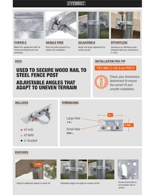 The Everbilt Adjustable Galvanized Steel Wood Post Adapter allows you to use 2-3/8 in. metal posts with your wooden fences to increase structural support and lifespan of the wooden fence. You can adjust the height on this steel to wood fence bracket to use on uneven terrain. Installation is easy. Once you attach the metal plate to your 2 in. to 4 in. wooden rails, use the included bolts and bracket to att [Yellow or White Triangle with] Symbol WARNING: Cancer and Reproductive Harm - www.P65Warnings.ca.gov. • Color: Silver • Size: 2 3/8 in