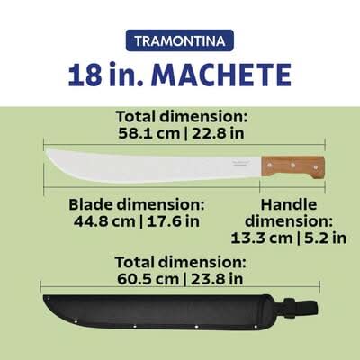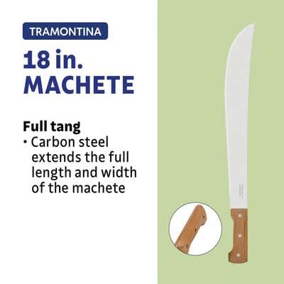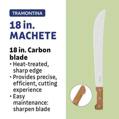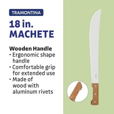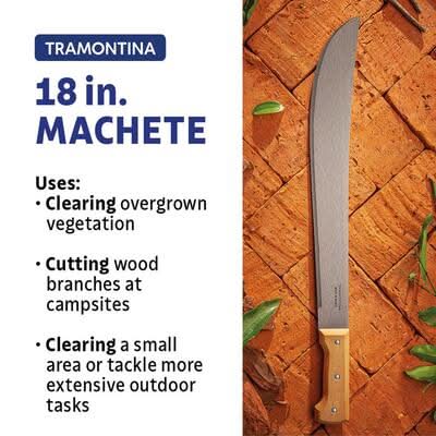 Experience unparalleled performance with Tramontina's 18 in. Machete, featuring a Carbon Steel Blade and Wood Handle, perfect for all your yard maintenance and utility tool needs. Its full tang blade and ergonomic design make it an essential addition to your outdoor toolkit. Tramontina's machete boasts a durable 18-inch heat-treated carbon steel blade with a protective layer of varnish, delivering remarkable cutting power and longevity. Conquer your yard work with ease due to the enhanced sharpness and strength of its blade. Size: 18 in